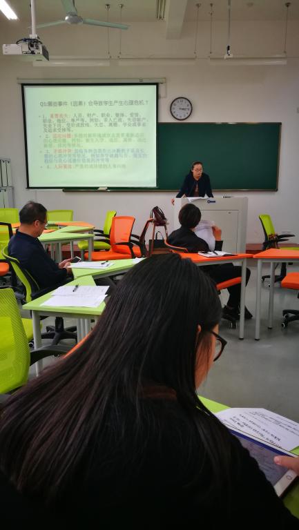4月11日下午在智慧教室222,黄色网站 邀请了心理中心朱丽芳老师为学院班主任老师开展了一场别开生面的团体辅导。此次团体辅导以高校学生心理危机干预为主题,以班主任工作为切入点,用团体心理辅导的形式,让班主任老师们即学习了相关工作知识技能,又可以交流工作经验和心得体会。学院班主任老师们在有引导的相互影响中多视角地学习,有理论,有实践,有体验,有分享,获得多重的反馈,从而可以更好地帮助学院学生心理危机干预工作。