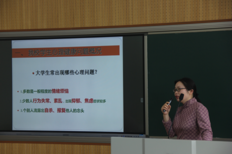 朱丽芳老师主要围绕黄色网站 学生心理健康问题概况、黄色网站 危机干预工作体系、危机干预知识学习和危机干预实操训练四个方面来进行讲授。首先,朱老师简单地讲解大学生常出现的一些心理问题,分析了心理问题产生的原因,并指出心理问题出现的高发时段。随后,她依次介绍了学校危机干预工作体系——四级工作网络、预警信息库和应急预案。接着,朱老师通过哪些因素会导致学生产生心理危机等六个问题给班主任们讲述了危机干预的知识。最后,朱老师模拟情境处理状况给班主任们进行了危机干预实操训练。
