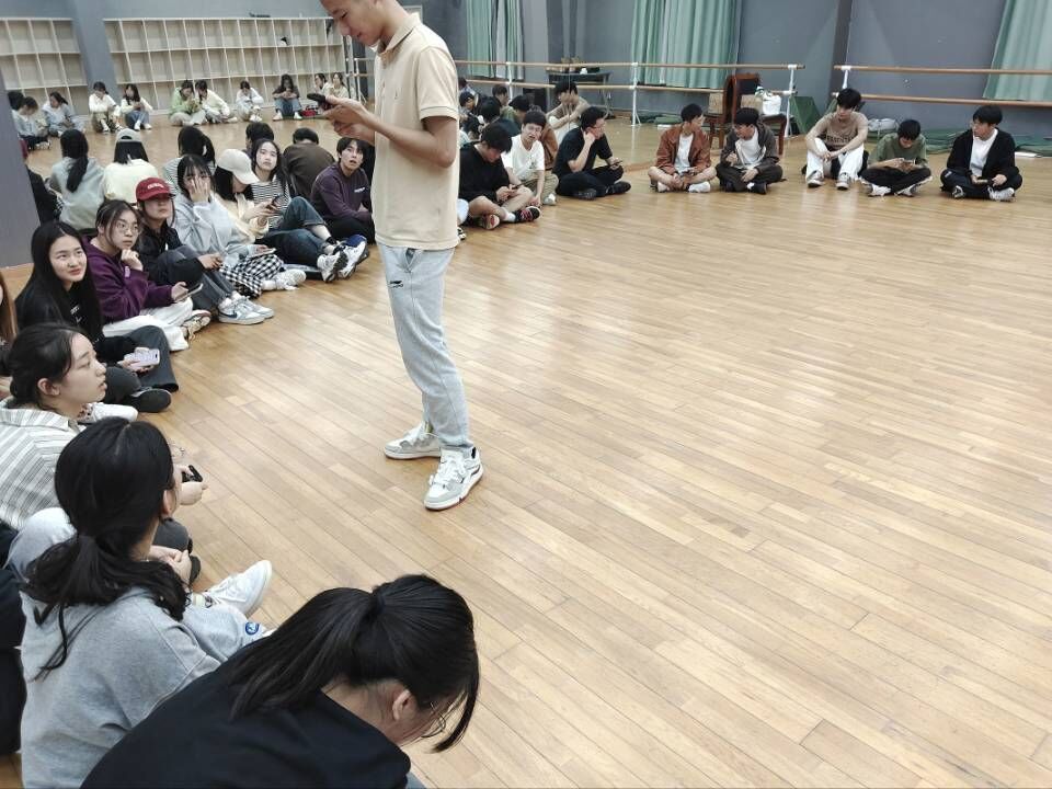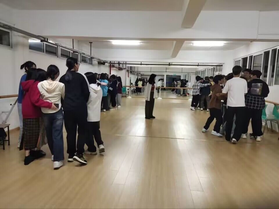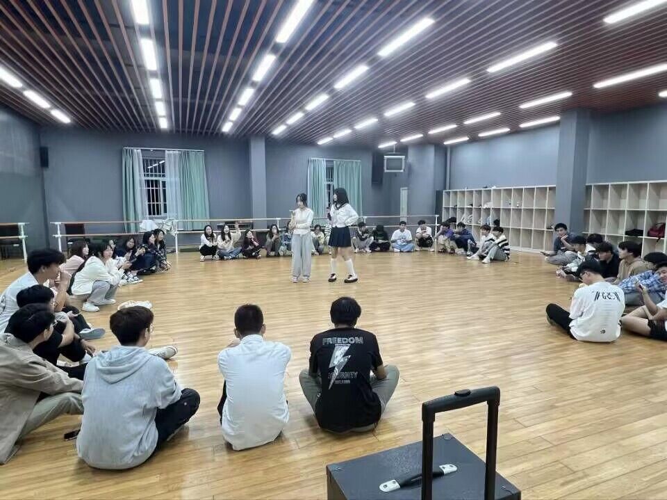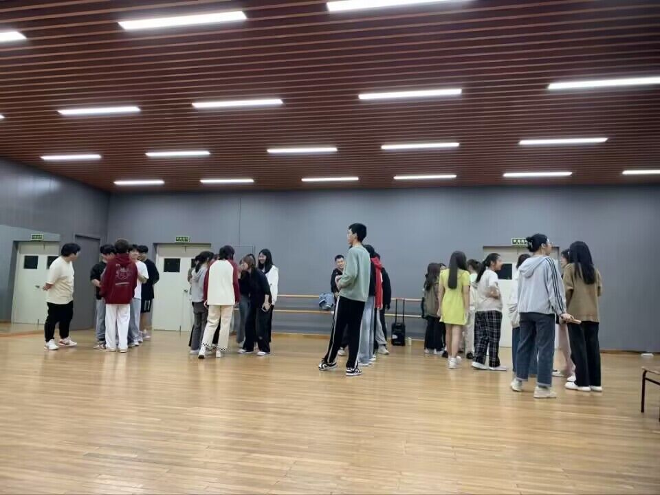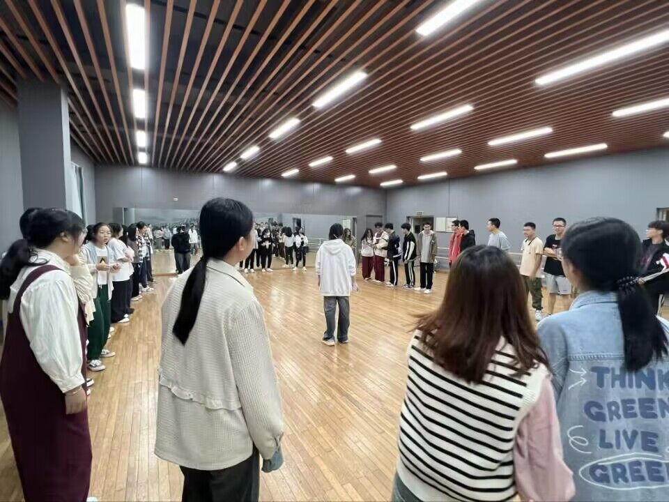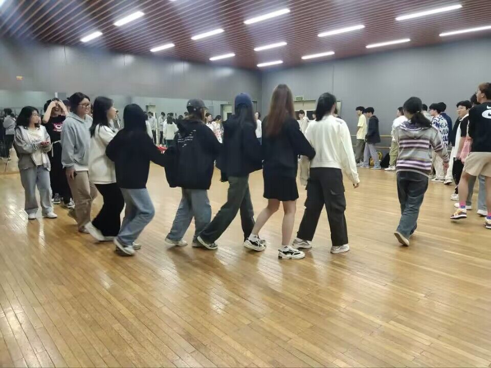 有趣的热身活动开始啦!同学们齐聚在舞蹈教室里,一同倾听着热情开朗的主持人解释游戏规则,眼中露出兴奋的光芒。