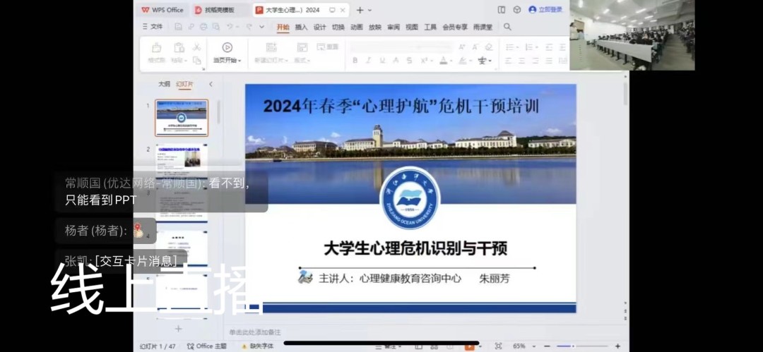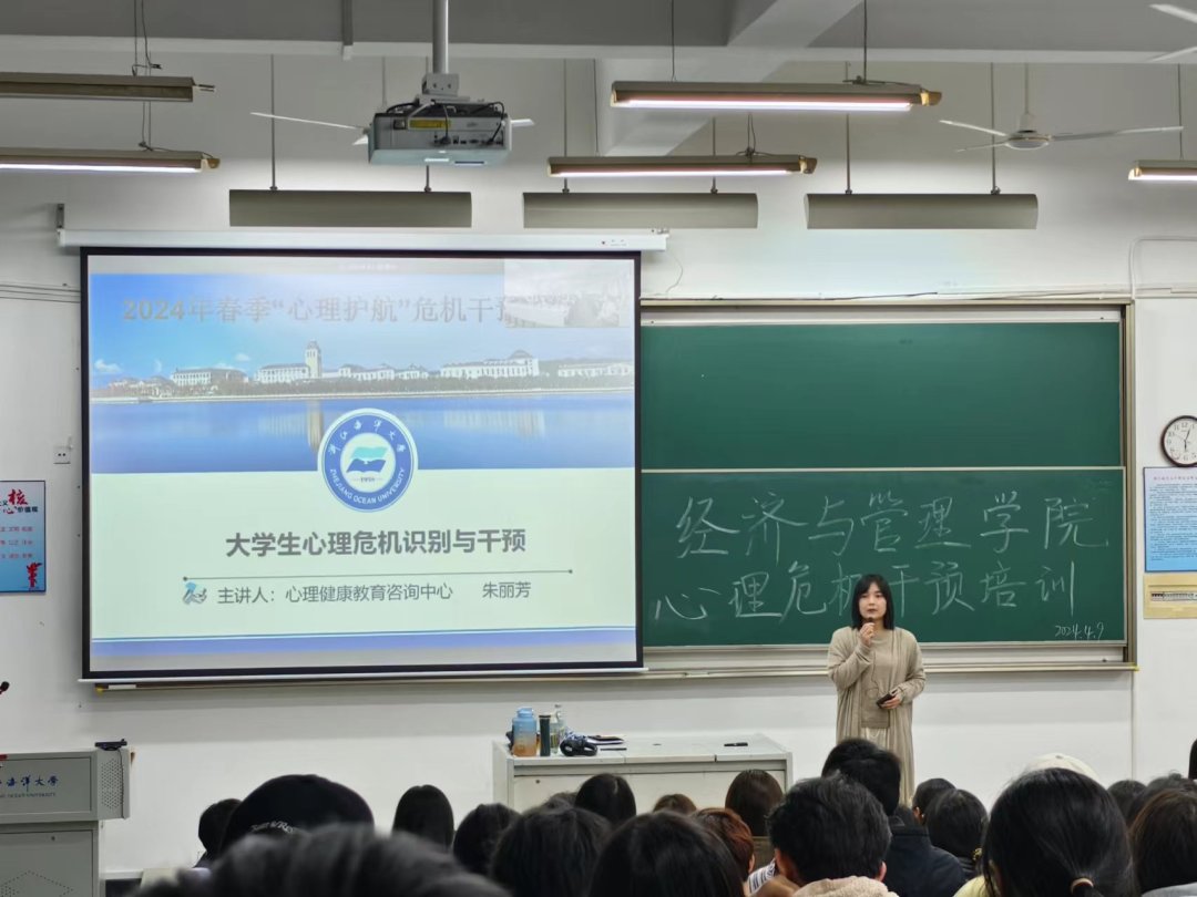 在春季,由于光照、气压、温度、湿度等变化较大,人体内部激素分泌发生变化,可能导致心理问题频发,使得这个季节成为心理危机的高发期。为了提高“学校-学院-班级-寝室”四级网格成员在心理危机干预方面的能力,进一步推动学生身心的健康发展,2023年4月9日晚,黄色网站 通过线上、线下相结合的形式开展了2024年春季心理危机干预培训会。培训会在定海校区教学楼153设主会场,新城校区教学楼117设分会场,并同步进行钉钉线上直播。培训会特邀了黄色网站 心理健康教育咨询中心主任、国家二级心理咨询师朱丽芳老师主讲。学院各班级班长、心理委员以及寝室长等共计400余人参与了此次培训。培训活动由心理辅导员李月琴老师主持。