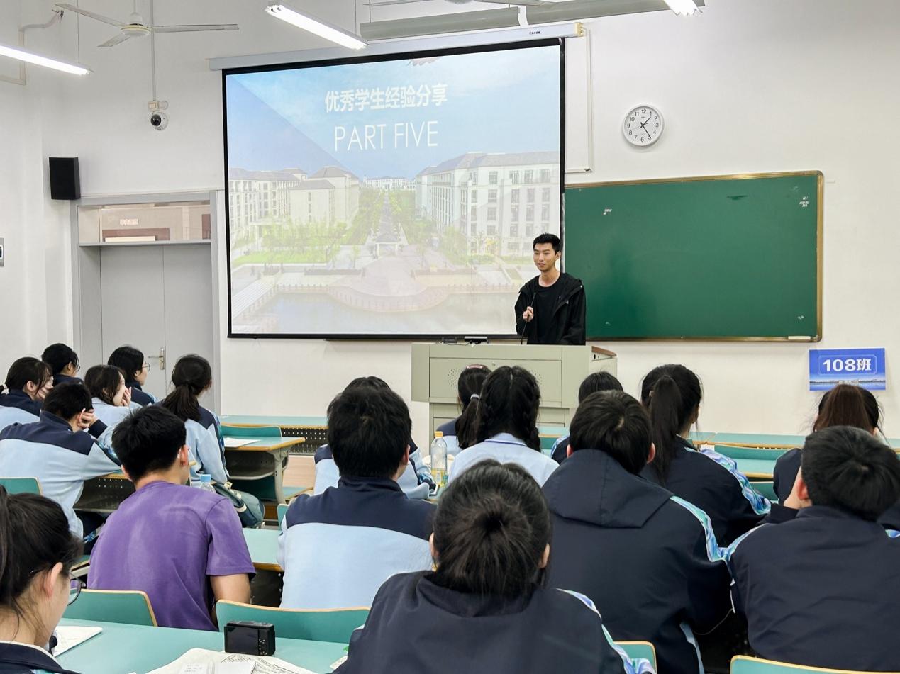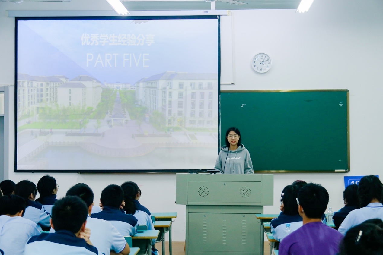 本次介绍还邀请优秀学生代表与大家进行经验分享和交流,A20经济2赵雅欣、A20旅游王迎晨同学从在校学习生活体会、升学就业前景、高中学习建议等多个维度向在场师生讲述自己在海大的学习生活经历,优秀学生代表还对在场同学殷切嘱托,指出高中阶段全身心投入学习,全方面发展,不要偏科,尤其要注意数学和英语的学习,并对同学们的提问一一解答,现场氛围积极活跃。