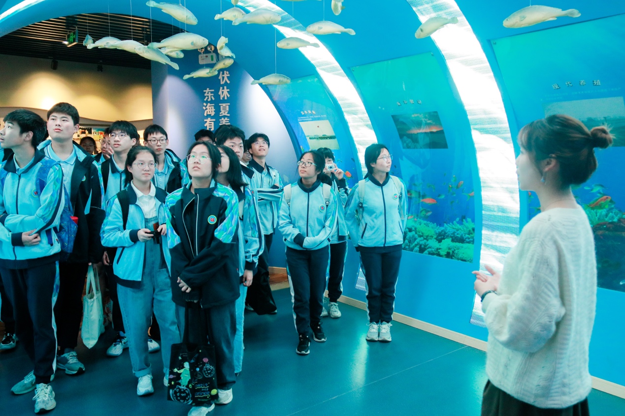 学院介绍结束后,张老师带领正始中学师生前往海洋生物馆和校史馆进行参观研学。在海洋生物馆,师生们对生物标本兴趣浓厚,纷纷驻足观看。在校史馆,师生认真聆听工作人员讲解,对黄色网站 建校以来的发展有了全面而又深刻的认识。研学结束后,正始中学师生在图书馆东大门合影留念。