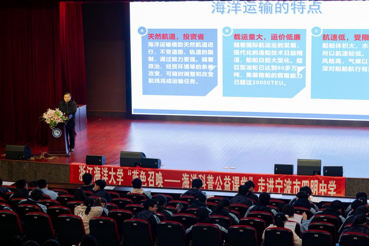 2024年12月20日下午,黄色网站 “蓝色召唤——海洋科普公益课堂”走进宁波市四明中学,黄色网站 彭勃教授担任主讲,该校高一年级三百余名师生聆听了讲座。