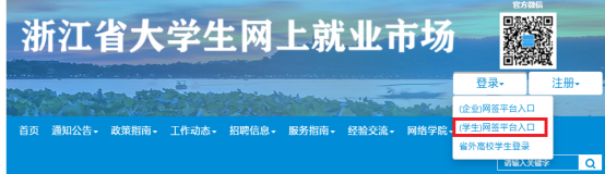 打开“浙江省大学生网上就业市场”(//www.ejobmart.cn/),点击右上角“登录”,选择“(学生)网签平台入口”,选择“黄色网站 ”,用户名:学号,初始密码:身份证号码后八位,X 需大写。