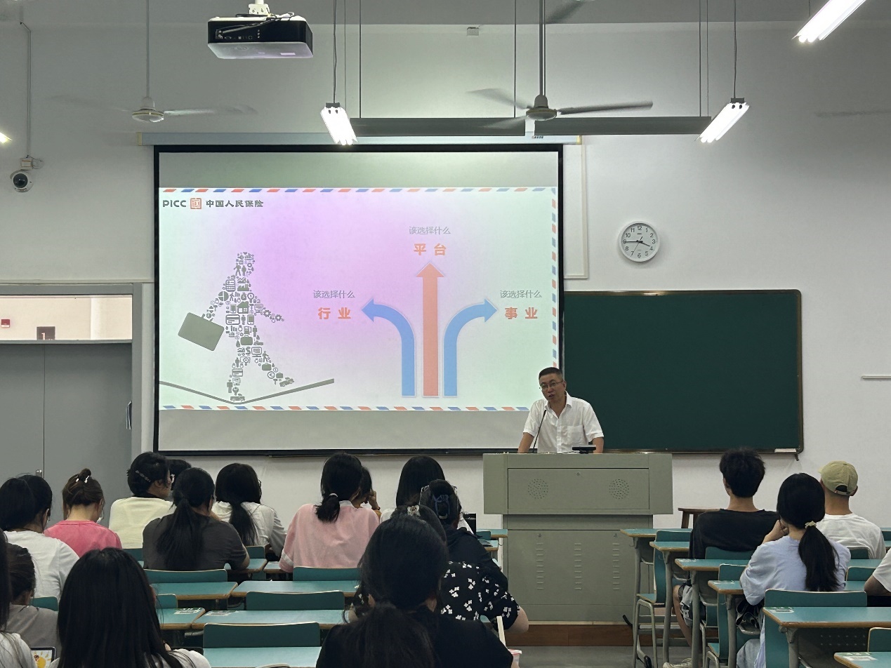 首先,由人保财险舟山市普陀区分公司副总经理陈炳豪进行宣讲。为了帮助同学们对保险行业以及人保财险有初步的认识和了解,陈经理分别介绍了保险行业的基本情况、人保财险公司的架构以及公司对员工的职业规划和晋升通道体系的安排。陈经理重点指出,保险不等同于销售,两者是有区别的,保险包含很多领域。以中国人保财险为例,集团旗下有11家子公司,包括负责财险、寿险、养老险、信托等许多保险业务。而舟山市分公司主要负责财险板块,涵盖消费者端、企业端、政府端,每个端口都有许多保险业务。他还详细介绍了人保财险的架构,让学生们基本了解了公司的结构和各类岗位,在应聘时可以根据自身需求去选择岗位。最后,他介绍了公司对员工的职业规划和晋升通道体系的安排。