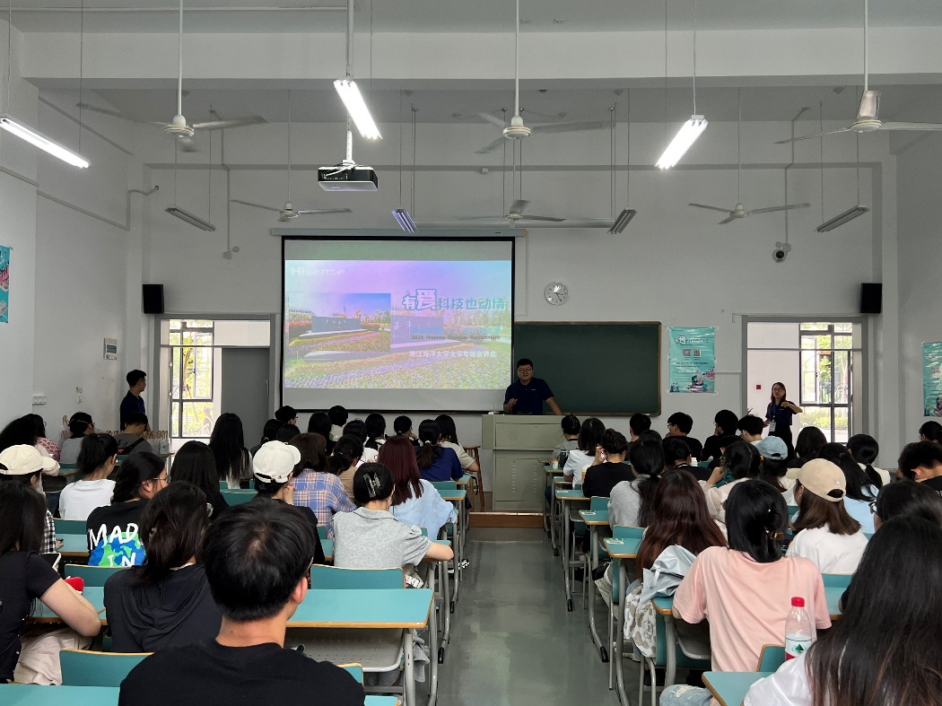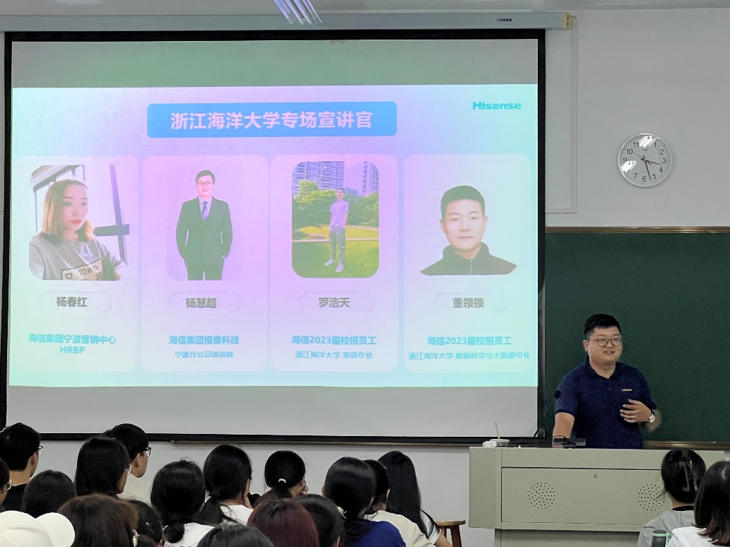 杨慧超培训师先是对现场的宣讲官做了介绍,然后讲述了海信历史、海信品牌、产业布局、全球版图等,让同学们对海信集团有了初步的了解。随后毕业生学长董领领讲述了自己的入职经历。最后杨春红经理介绍了海信的用人观、新员工的培训流程、员工成长与环境、岗位类别、招聘流程、薪酬福利和办公环境。后浪滔滔,滚滚而来。青年人应当大有作为,海信持续为年轻员工提供更多机会和更大的舞台!