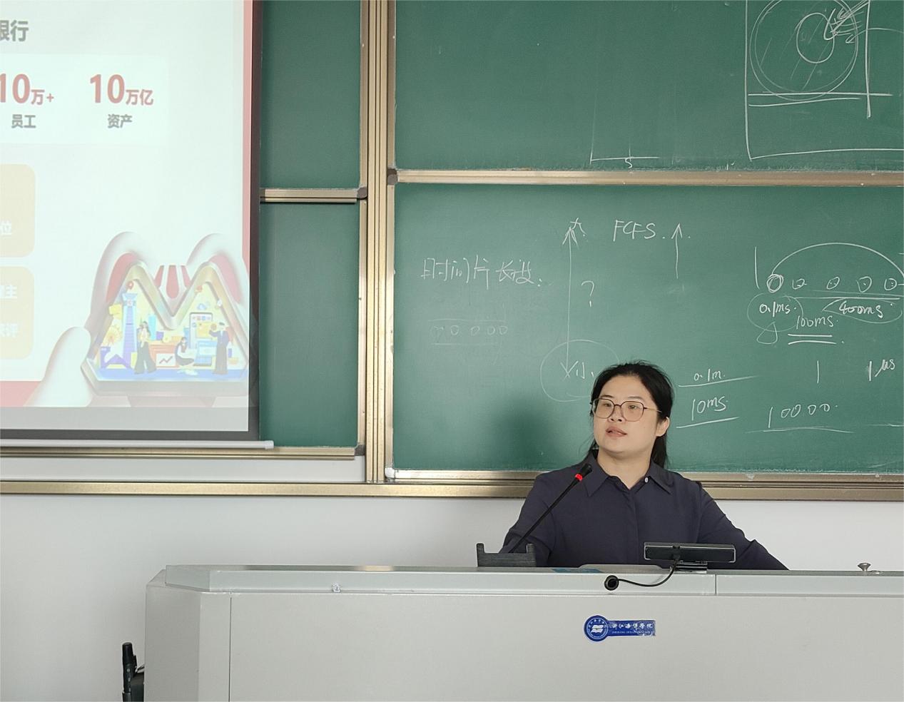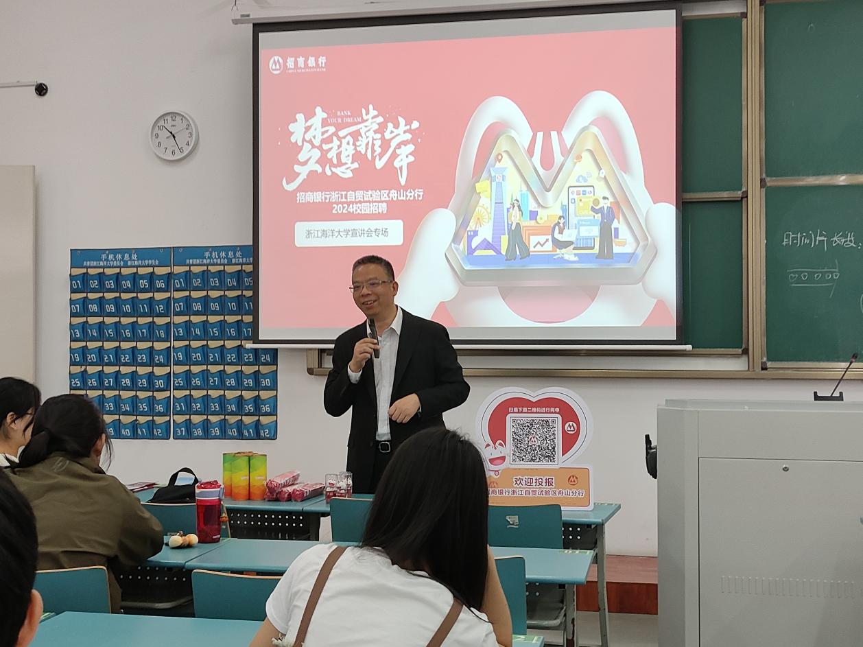 刘谨源从招商银行的实力、特色、国际化综合化、企业文化、人力资源理念、员工的培养与发展、薪酬福利体系等方面为同学们讲解了银行的基本情况及其优势,并详细介绍了本次招聘的岗位及要求。她还从舟山地理位置角度介绍了招商银行舟山分行的优势与潜力,从舟山政府对人才引进出台的一系列福利讲解了舟山分行。分行行长姚晓瑞也针对同学们提出的各类问题进行了耐心解答。