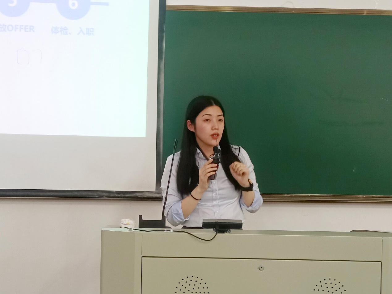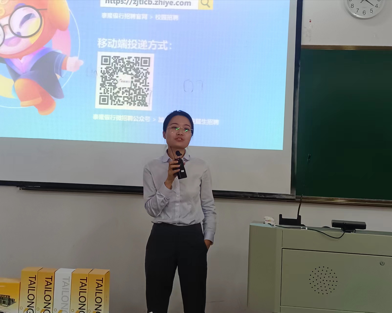 随后,人力资源部负责人结合自身经历,为同学们讲述了她在泰隆银行的所见所感所想,让同学们感受到泰隆银行是一家有爱、有关怀的银行,也更加激起了同学们报名泰隆银行工作岗位的兴趣。