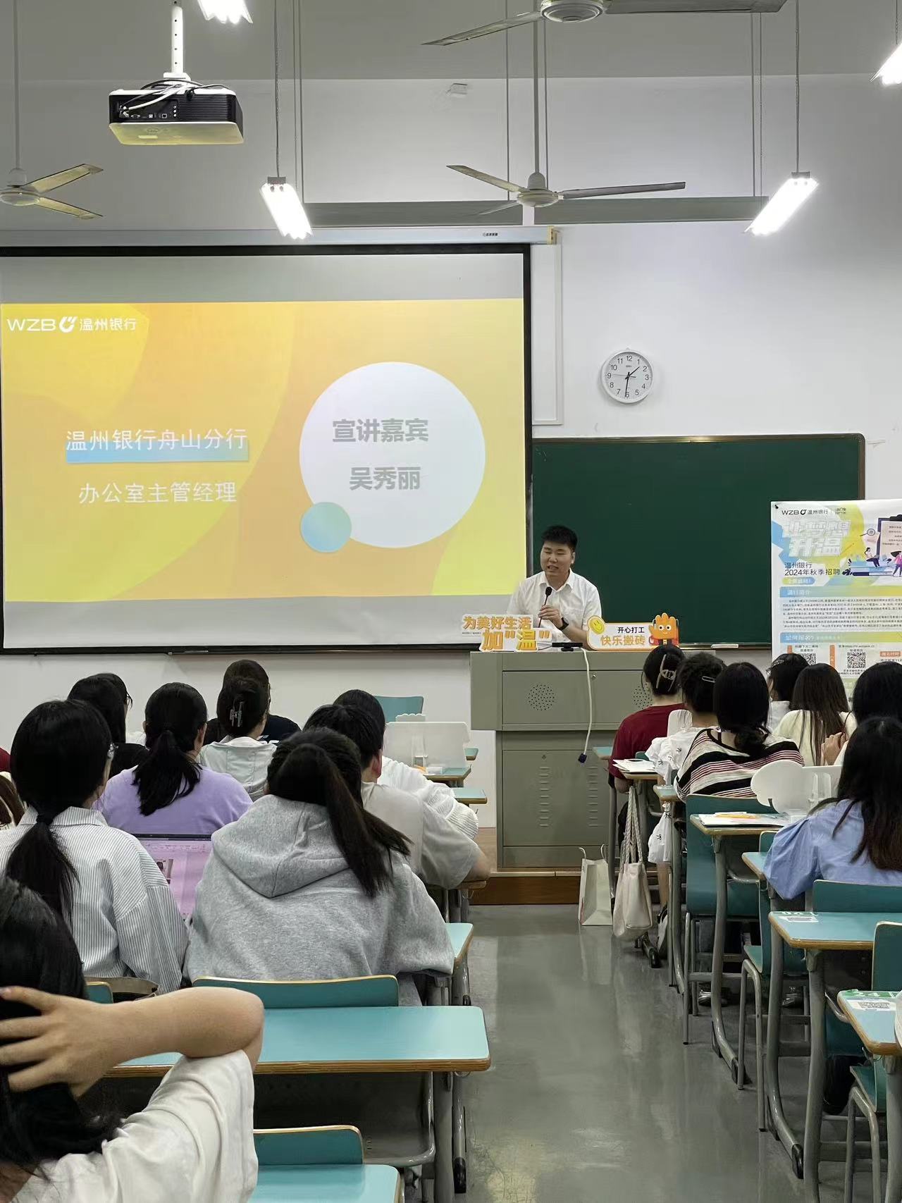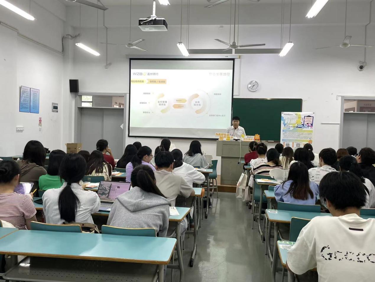 为扎实推进共青团促进大学生就业行动,使黄色网站 学生广泛了解行业动态,提升其就业竞争力,2024年9月27日下午,黄色网站 在新城校区新教学楼B103顺利举办温州银行舟山分行校园宣讲会。学院共120余名大三、大四学生参加,此次宣讲会由温州银行舟山分行办公室主管经理吴秀丽主持。
