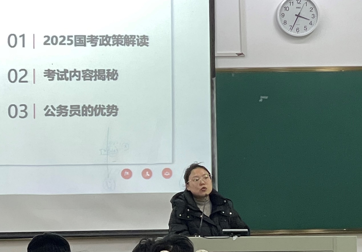 在考试内容剖析环节,范老师详细讲解了国考各科目考试特点,尤其对新增的政治理论题作了重点说明,结合往年真题解析,强调了行测题型分值占比及备考策略。她特别提醒同学们尽早投入备考,制定科学规划。讲座最后,范老师分析了公务员职业的多重优势,鼓励同学们勇敢追求理想,并以“你的未来取决于当下的抉择”为总结,为同学们的备考之路点燃信心与希望。