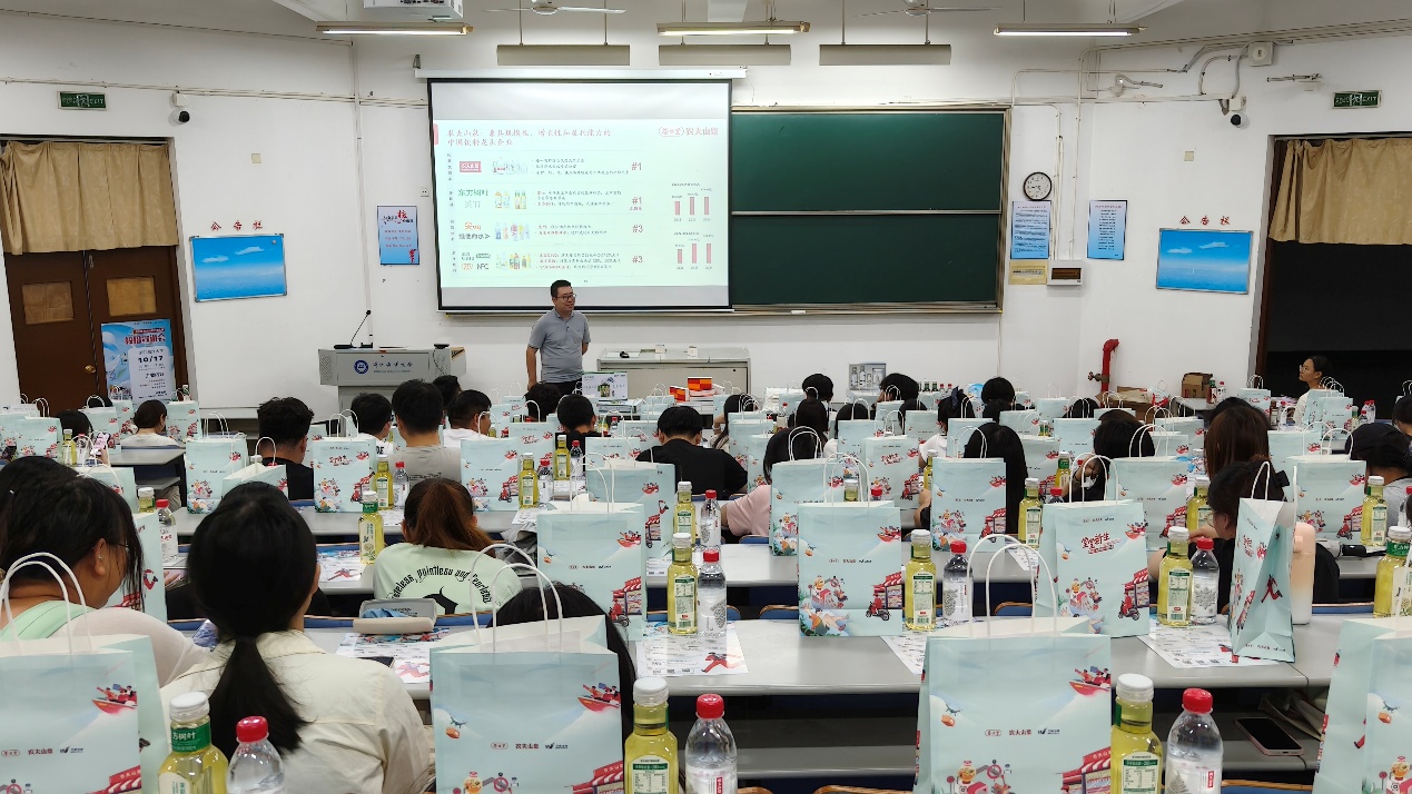 在校园招聘宣讲会上,养生堂公司刘佩经理围绕企业发展、招聘规划及求职建议作了详细介绍。刘经理系统讲解了养生堂集团的发展历程及当前建设布局,帮助同学们全面了解企业整体情况。他特别强调,第一份工作对个人职业生涯具有深远影响,择业时应注重“行业选择”,并提前做好职业规划。同时,他指出,依托公司强大的品牌影响力,员工能够获得长期的职业背书,充分展现出农夫山泉在校园招聘中的吸引力与竞争优势。