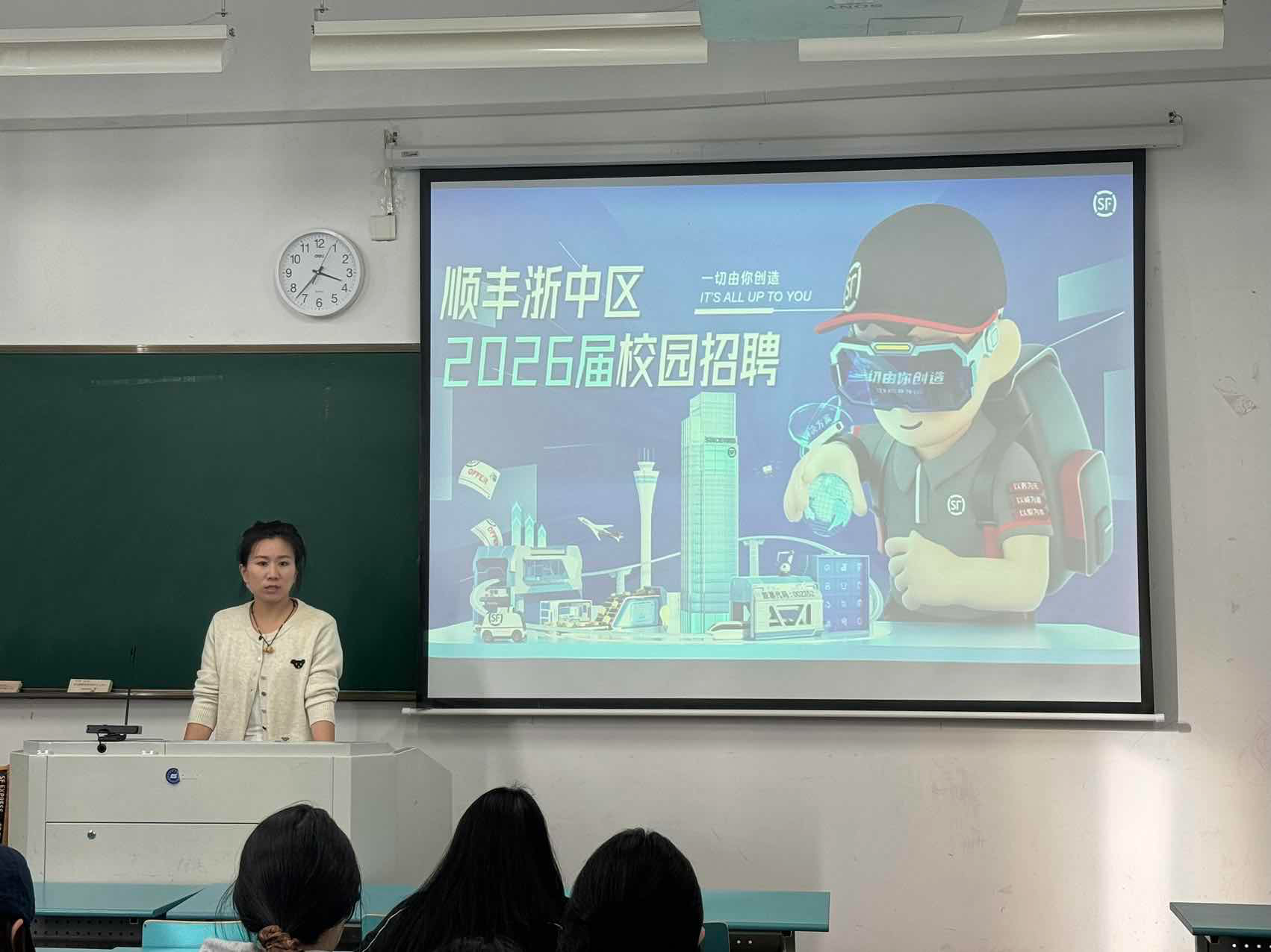 卞老师详细介绍了顺丰集团的发展历程、现状与未来前景,生动展现了企业的整体风貌,令同学们深受吸引。随后,她重点讲解了顺丰集团的行业优势,如智能无人机航空运输、冷链物流等领域的领先实力,让大家充分认识到顺丰在行业中具备强劲的竞争力。在互动环节中,卞老师还针对同学们最为关心的招聘岗位进行了详细说明,主要涵盖经营销售及各类专业岗位。她强调,公司十分注重员工的学习能力,并将提供系统的专业培训,确保每位员工都能胜任岗位职责、实现自我成长。