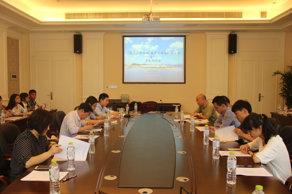 国际学术交流中心105会议室召开。浙江大学教授王诗宗、中共舟山市委政法委社会综合治理办公室专职副主任杨宏伟、舟山新区新城管委会党群工作部副部长陈敏刚、舟山市民政局社会组织服务中心副主任李志杰应邀参会;经管学院党委书记、副院长全永波教授、副院长周学锋教授、公共管理系副主任高猛、公共管理系左红娟老师列席会议;22位“大学生社区工作室”学生团队代表参与研讨会会,进行工作成果汇报。