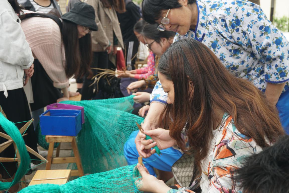 蚂蚁公社纪念馆门前人们聚成了一团,到访学习的党员师生、岛上从事手工业的妇女围着:“简陋的工作台”——两条板凳,妇女们手把手教授访客织渔网、编麻绳,在这个岛上,他们有一个特别的称谓——“海岛巾帼”……