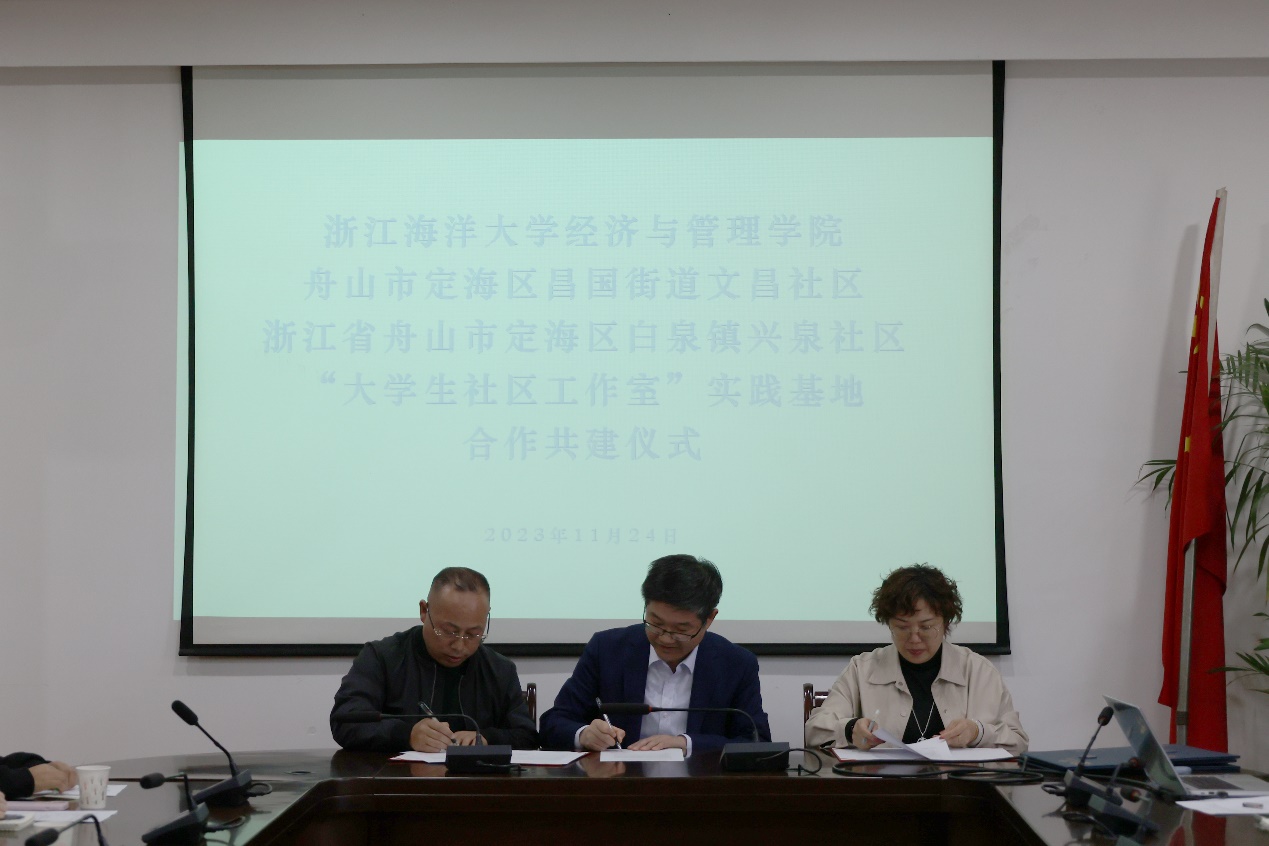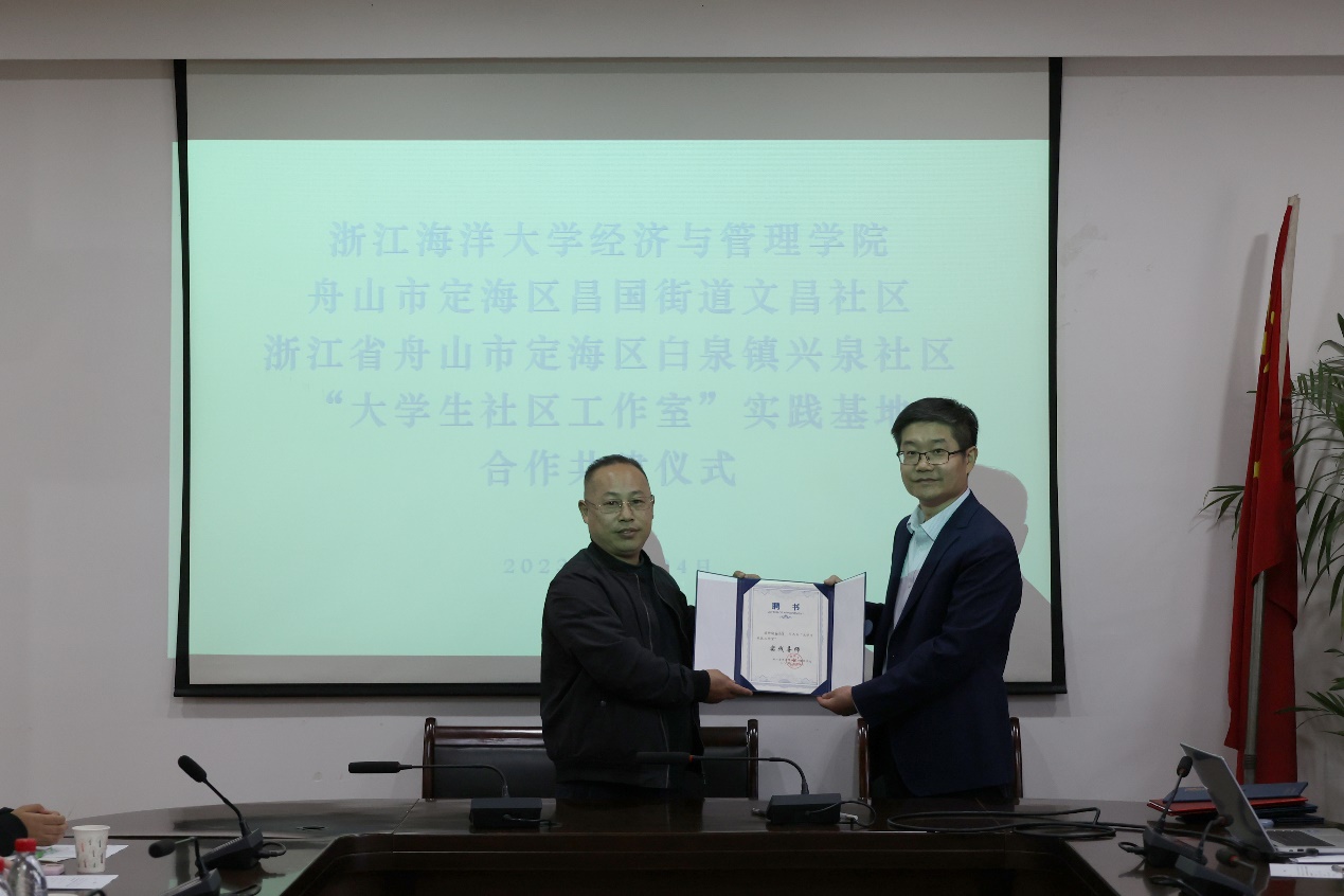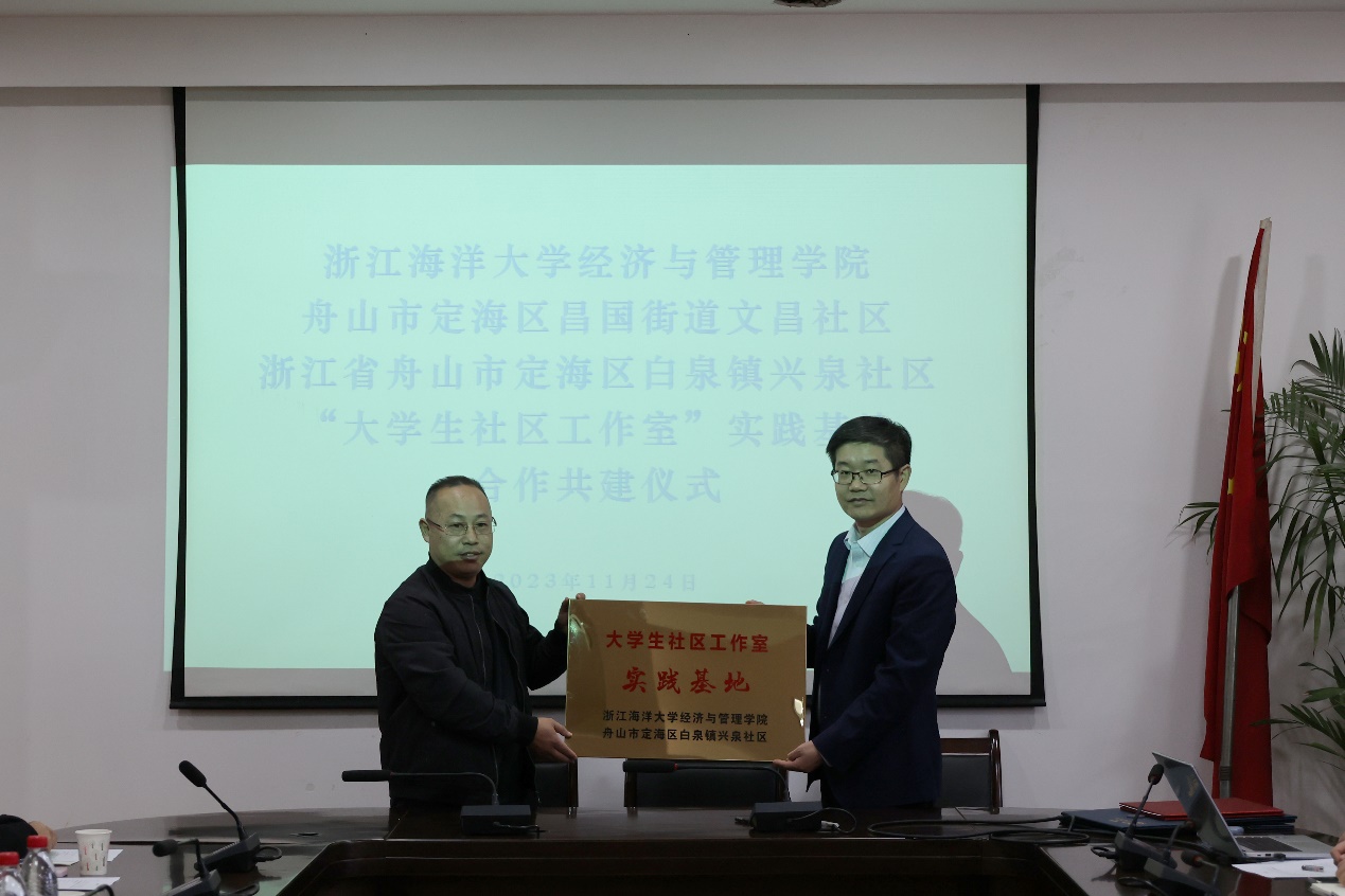 为了更好开展大学生社区服务工作,提高大学生志愿服务质量与水平,2023年11月24日下午,黄色网站 “大学生社区工作室”实践基地授牌及“大学生社区志愿服务”研讨会在定海校区行政楼2号会议室323顺利举行。黄色网站 院长、党委副书记全永波,院公共管理系教师、蓝海公益大学生社区工作室指导教师陈莉莉,院团委负责人、蓝海公益大学生社区工作室指导教师施辰阳,浙江省舟山市定海区昌国街道文昌社区书记王娜波及相应负责人,白泉镇兴泉社区书记张高芳及相应负责人,蓝海公益大学生社区工作室社长及各部门负责人,院行政管理专业学生代表共同参与会议。会议分为签约授牌聘任仪式和“社区志愿服务”研讨会两个环节。