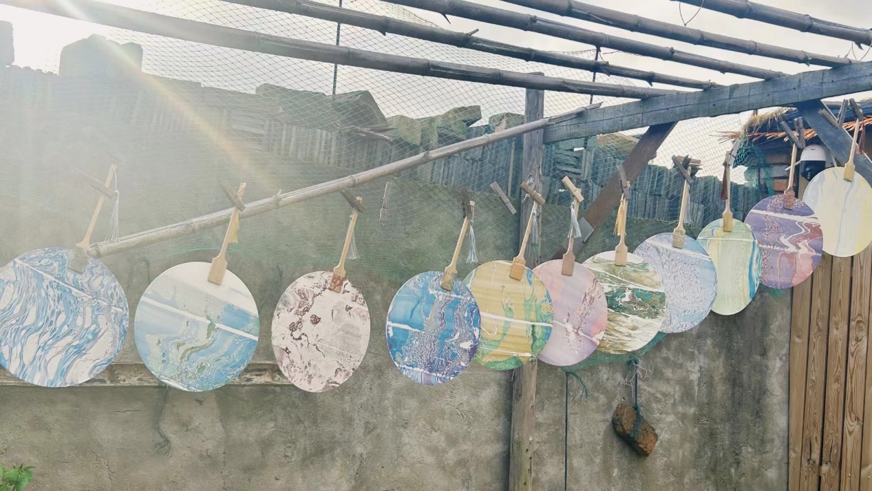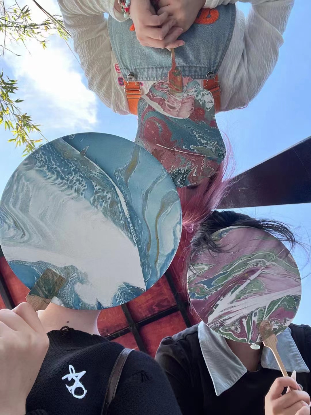 居山小院的非遗讲师为大家详细讲解了漆扇的历史、文化背景以及漂漆扇的制作方法及技巧。彩漆漂浮在水面上,只需要将素扇慢慢放入水中,大漆就会随着水流附着在素扇上,水因势而走的痕迹保留了下来,色彩穿插交错随机而成,流云变幻。老师和同学们选择好自己心仪形状的素扇后,运用左右晃动式、旋转式、直入式等不同手法浸入素扇,色漆便在扇面上优雅地舞动。短短十几秒钟,一把把独一无二的漆扇便制作完成了。将扇子晾干、包装后,它们的美感自然而生、妙趣天成,精致演绎了气韵生动的东方美学。