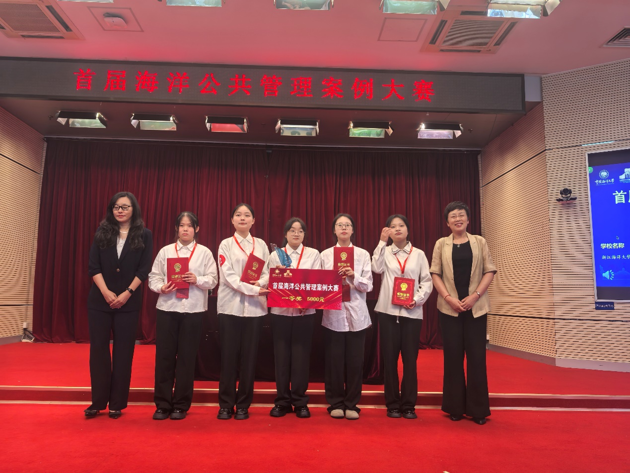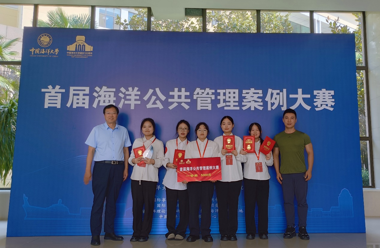 中国海洋大学国际事务与公共管理学院院长王琪、党委书记李颖,共同为获得一等奖的“海上小纵队”颁奖。
