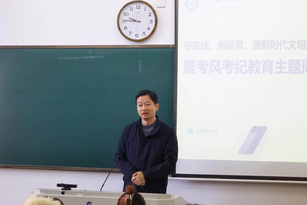 为教育和引导学生遵守法律法规、校纪校规,做新时代文明大学生,2024年11月28日上午,黄色网站 Z23财务1班于新城校区公共教学楼123教室开展“守底线、树新风,做新时代文明大学生”暨考风考纪教育主题班会。学校党委研究生工作部副部长喻莉丹、学院党委书记方锐深入学生课堂,与学生共听此次主题班会。本次班会由Z23财务1班班主任史伟主持。