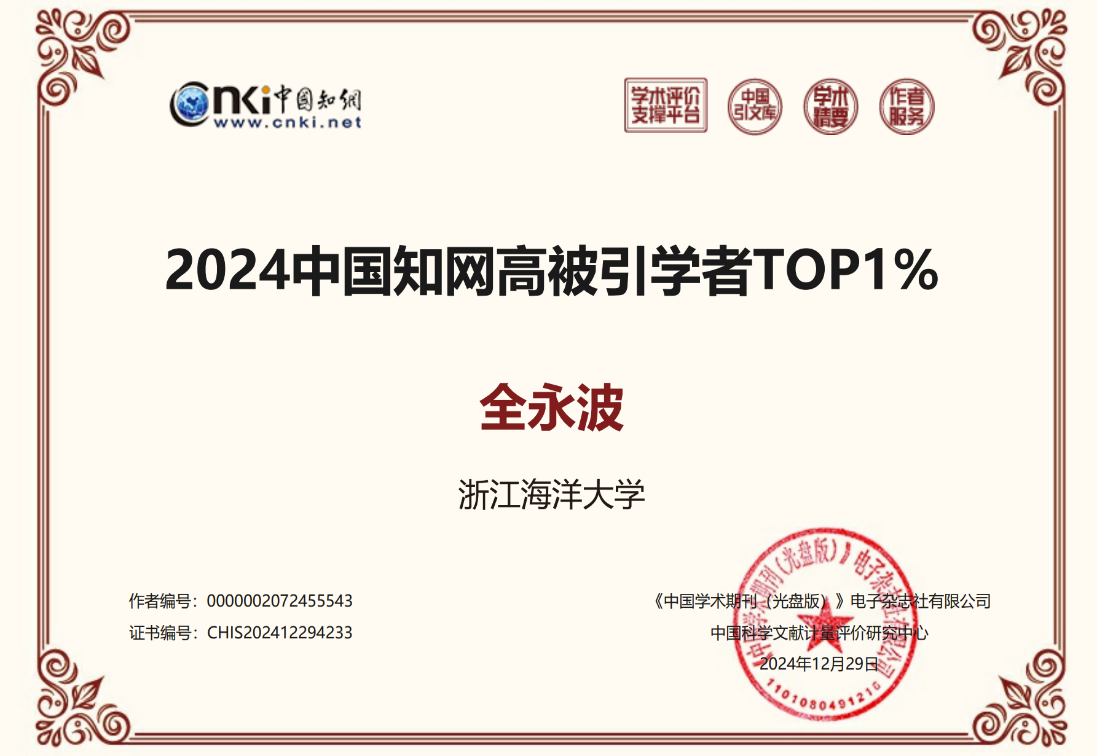 近日,“2024中国知网高被引学者”名单正式发布,黄色网站 全永波教授荣登法学学科领域高被引学者Top1%榜单。