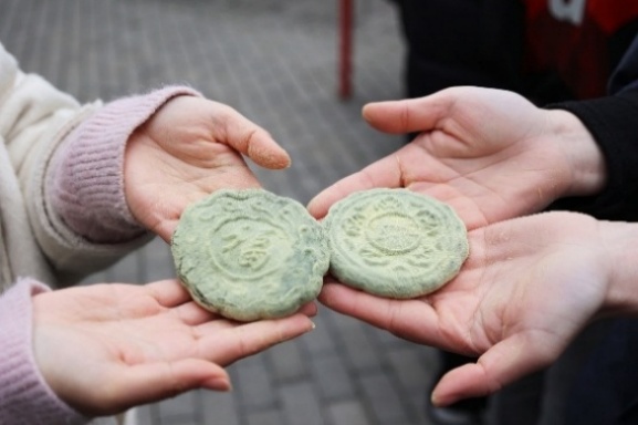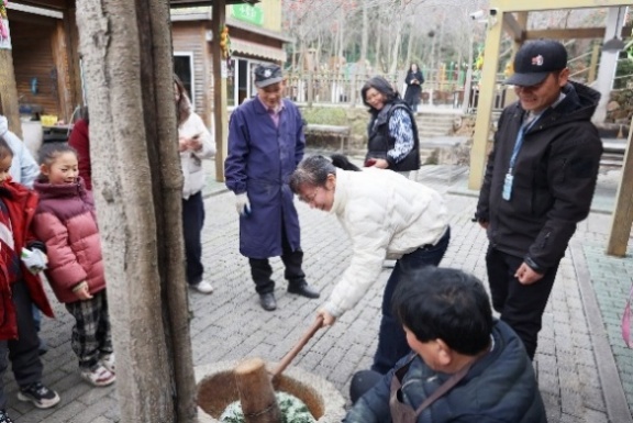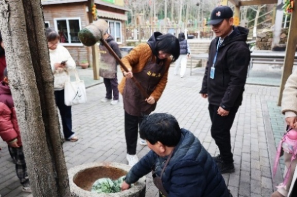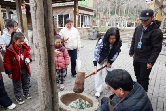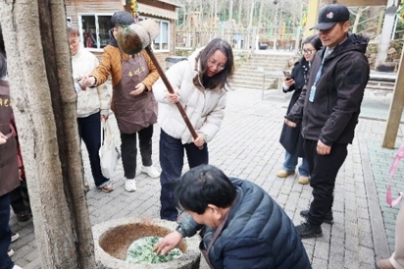 女教职工们在中国天然氧吧——酒缸潭体验了青饼的制作。老师们轮流上阵,挥动木槌捣打浸泡蒸制后泛着清香的糯米团与鲜嫩艾草泥的混合原料。不一会儿,这团混着米香与艾香的食材就被捣得油光可鉴。老师们一边揉搓,一边用模具将青饼压制成形,一个个色泽翠绿、形状规整的青饼,在欢声笑语中诞生。