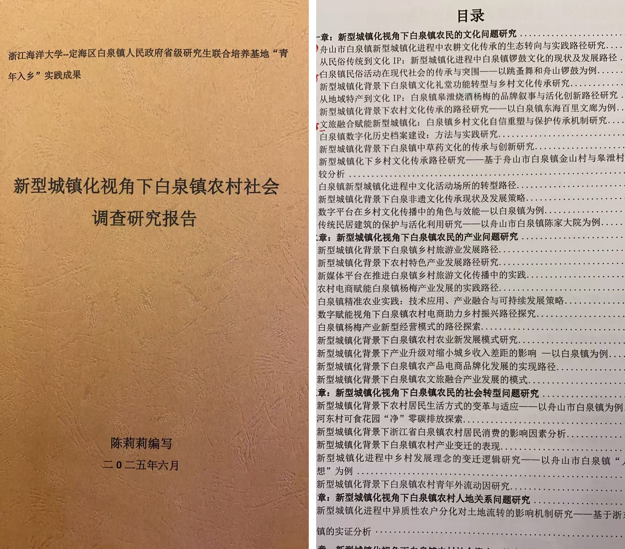 在陈莉莉老师指导下,6支调研团队采用“实地考察+深度访谈+问卷调查”三位一体调研法,对金山村、河东村等7个村(社区)的产业现状、生态保护、文化传承等维度展开多维度考察,形成《新型城镇化视角下白泉镇农村社会调查研究报告》成果集。