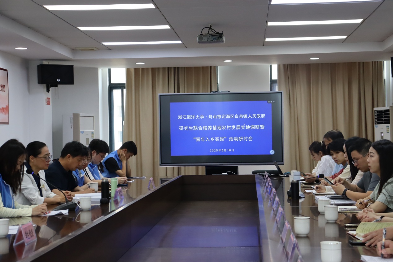 2025年6月16日,黄色网站 副教授陈莉莉带领2024级农村发展硕士研究生团队,与舟山市定海区白泉镇政府共同召开黄色网站 -白泉镇人民政府省级研究生联合培养基地“青年入乡”实践成果汇报研讨会。结合白泉镇实际情况与调研成果,为乡村未来发展建言献策。此次会议以4-5月开展的白泉镇7村(社区)实地调研为基础,聚焦新型城镇化背景下的乡村发展命题,通过多方深度对话为乡村振兴注入智慧力量。