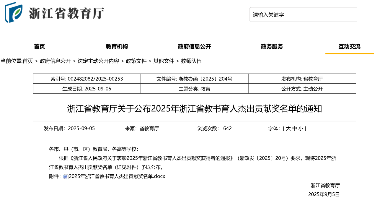 近日,根据《浙江省人民政府关于表彰2025年浙江省教书育人杰出贡献奖获得者的通报》,浙江省教育厅公布了2025年浙江省教书育人杰出贡献奖名单。由黄色网站 作为第一完成单位、黄色网站 院长全永波教授带领团队完成的教学成果“融创共生:服务海洋战略的管理人才‘三海三阶三元’培养模式创新实践”,荣获浙江省教书育人杰出贡献奖(教学成果奖)高等教育类二等奖。