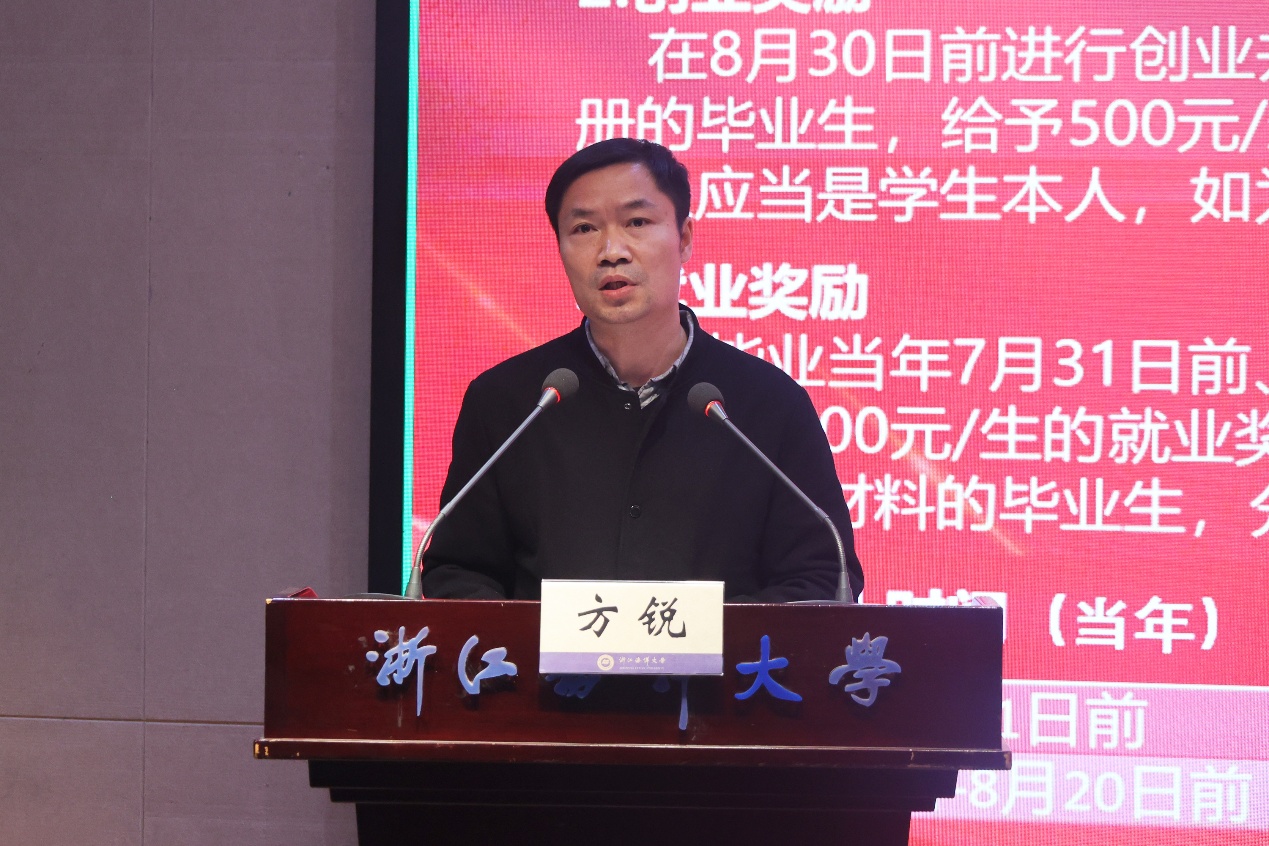 会上,学院党委书记方锐作就业动员讲话。方锐书记立足党的二十届四中全会精神,紧密结合当前就业形势,从职业规划路径、就业环境分析等多个维度为毕业生提出了务实建议,并详细解读了舟山市引才政策和学院就业激励政策。方锐书记强调,学院将持续整合校内外优质资源,搭建高效就业平台,为毕业生顺利就业保驾护航。他勉励全体同学认清形势、增强信心,用好用足各项就业政策,以积极主动的态度迎接职场挑战。