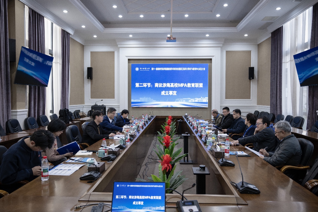 会议第二环节,与会代表就发起成立涉海高校MPA教育联盟事宜展开商讨。各高校MPA教育中心主任一致认为,联盟有助于推动校际资源联动与共享,突出MPA人才培养的涉海特色,并吸引更多高校加入。联盟旨在搭建涉海MPA科教合作平台,促进各单位间人员交流与科研协作,深化该领域教育研究的交流合作。