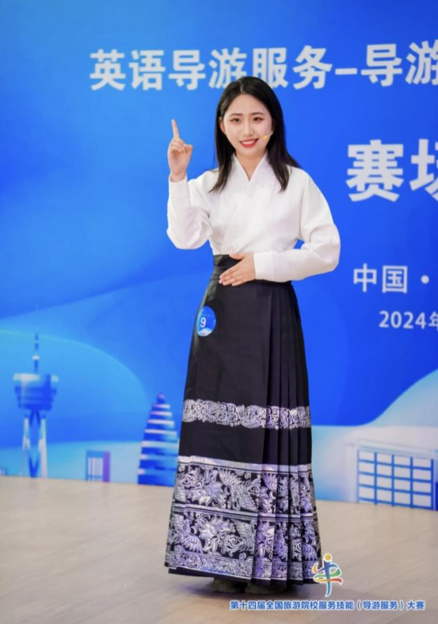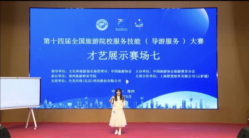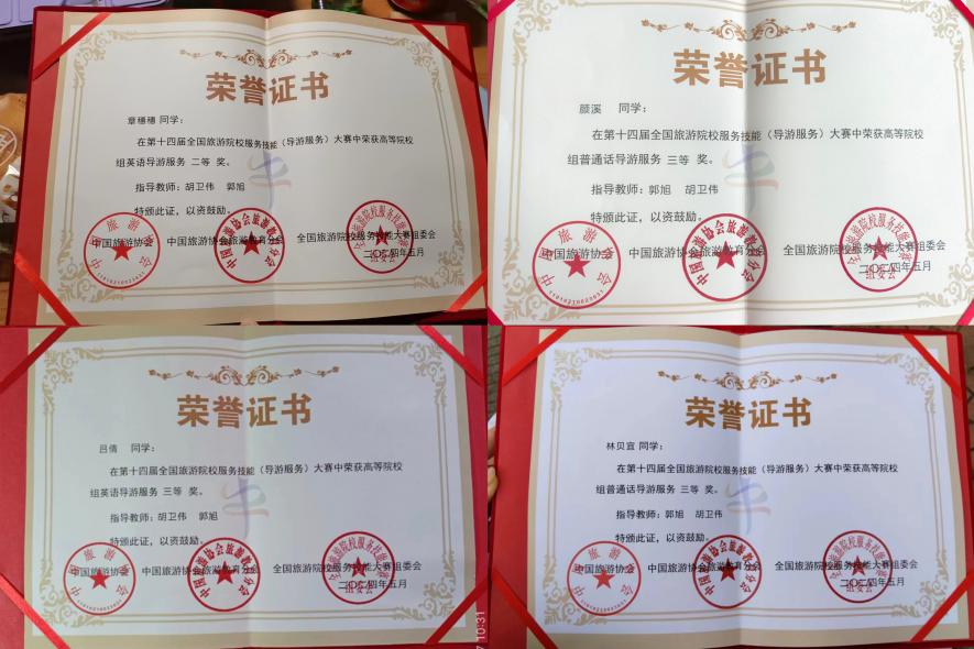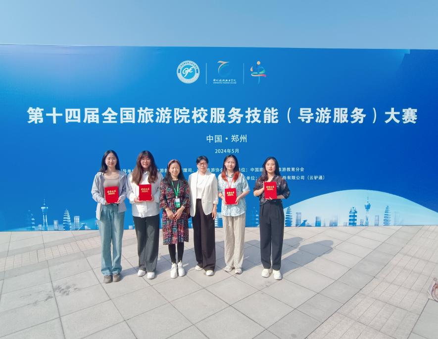 为深入学习贯彻党的二十大精神,落实习近平总书记关于旅游发展和高等教育的重要指示,助推旅游业成为新兴的战略性支柱产业和具有显著时代特征的民生产业、幸福产业,促进旅游高等教育高质量发展,2024年5月23日至5月26日,第十四届全国旅游院校服务技能(导游服务)大赛在郑州举行。由黄色网站 旅游管理系胡卫伟、张敏红、刘丹丹、卫玉倩老师带队,中文组2名同学和英文组2名同学参赛。历经三天激烈的比赛,A21旅游2章穗穗获高等院校组英语导游服务二等奖、A22旅游2吕倩获高等院校组英语导游服务三等奖、G21旅游颜溪和G22旅游林贝宜获高等院校组普通话导游服务三等奖。