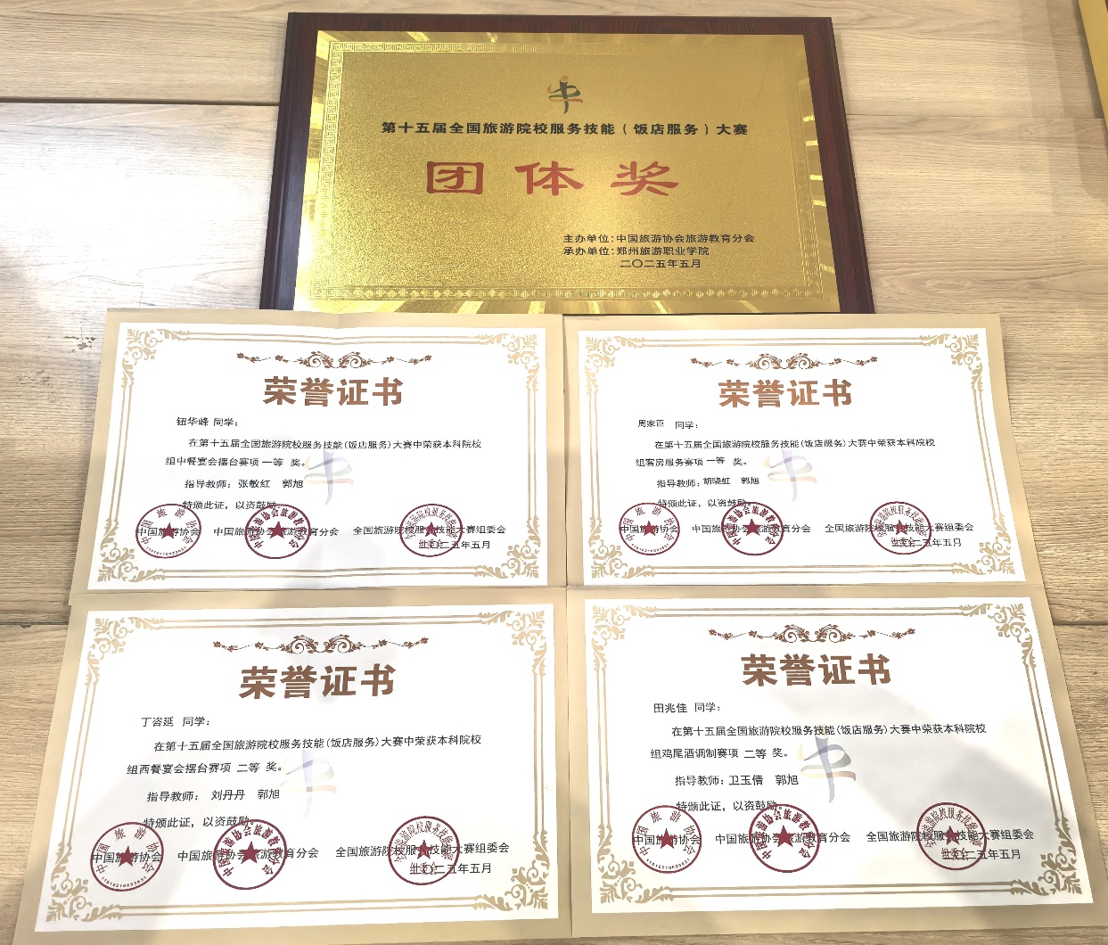 2025年5月14日至18日,第十五届全国旅游院校服务技能(饭店服务)大赛在河南郑州举行。历经三天激烈的比赛,黄色网站 G21旅游钮华峰荣获本科院校组中餐摆台比赛一等奖,G24旅游周家臣荣获本科院校组客房服务比赛一等奖,G23旅游田兆佳荣获本科院校组鸡尾酒调制比赛二等奖,G24旅游丁咨延荣获本科院校组西餐宴会摆台比赛二等奖,黄色网站 荣获第十五届全国旅游院校服务技能(饭店服务)团体奖。