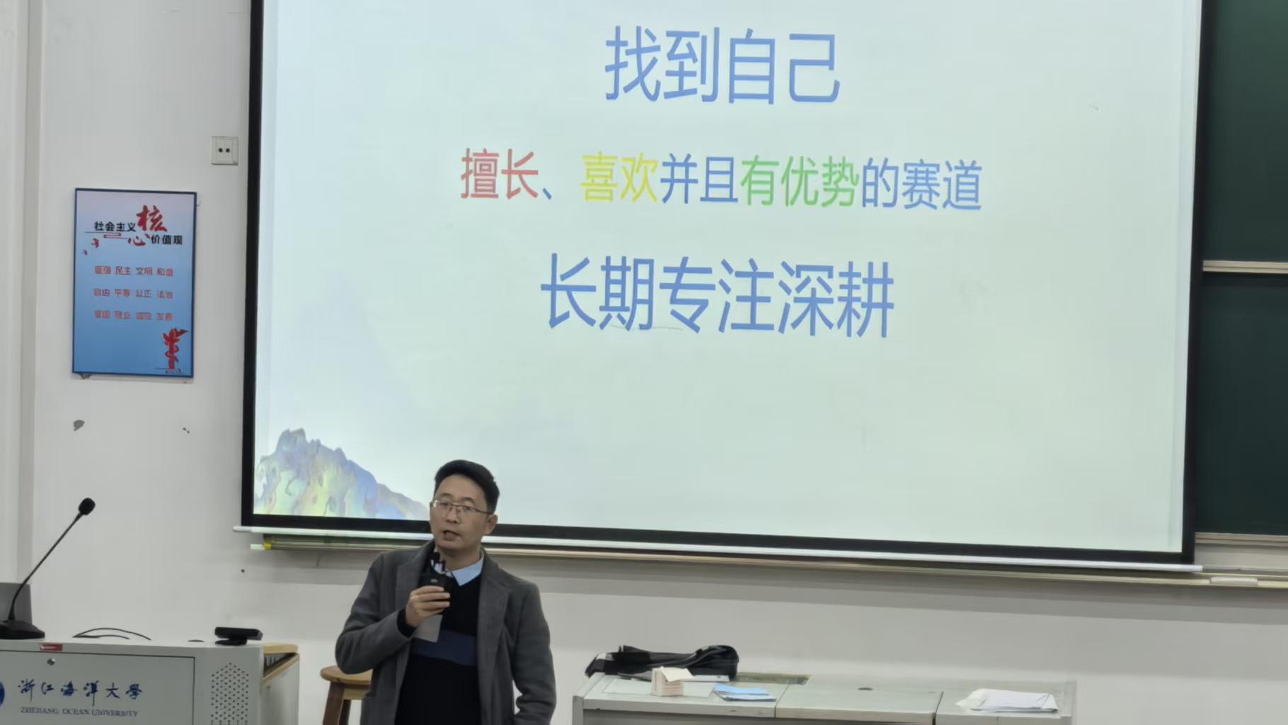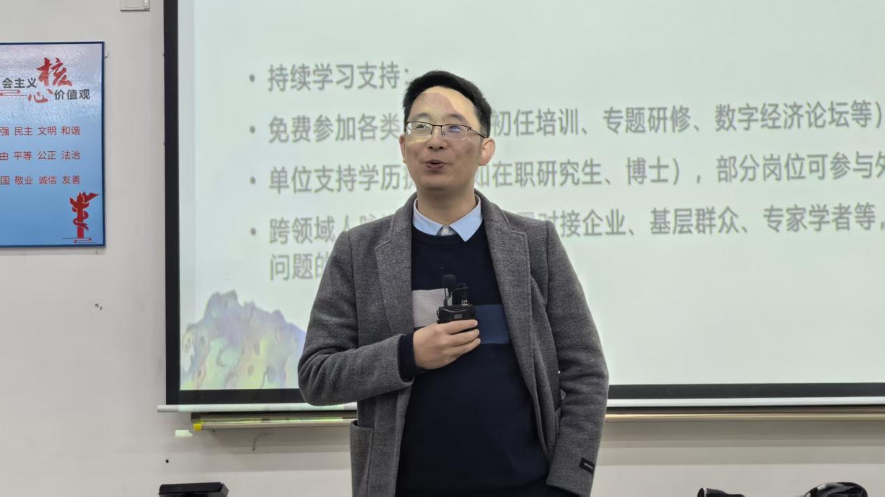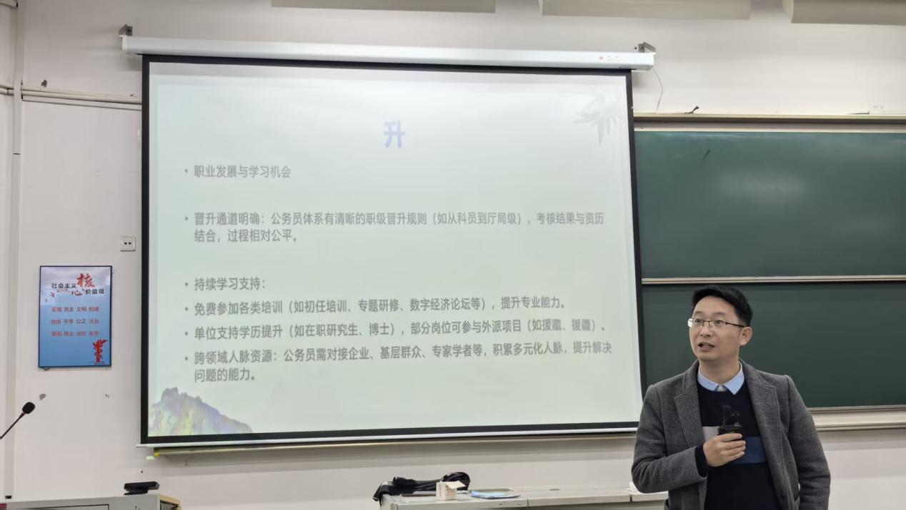 陈谦校友在分享中回顾了自己十三年来跨界从政、经商、教学等多个领域的经历。他表示,这些丰富的尝试最终让他更清晰地找到适合自己的赛道。对于同学们关心的职业选择问题,他以客观视角分析了公务员职业的优势,也坦诚指出其高要求、高竞争等现实挑战,鼓励同学们在认知充分的基础上做出理性判断。