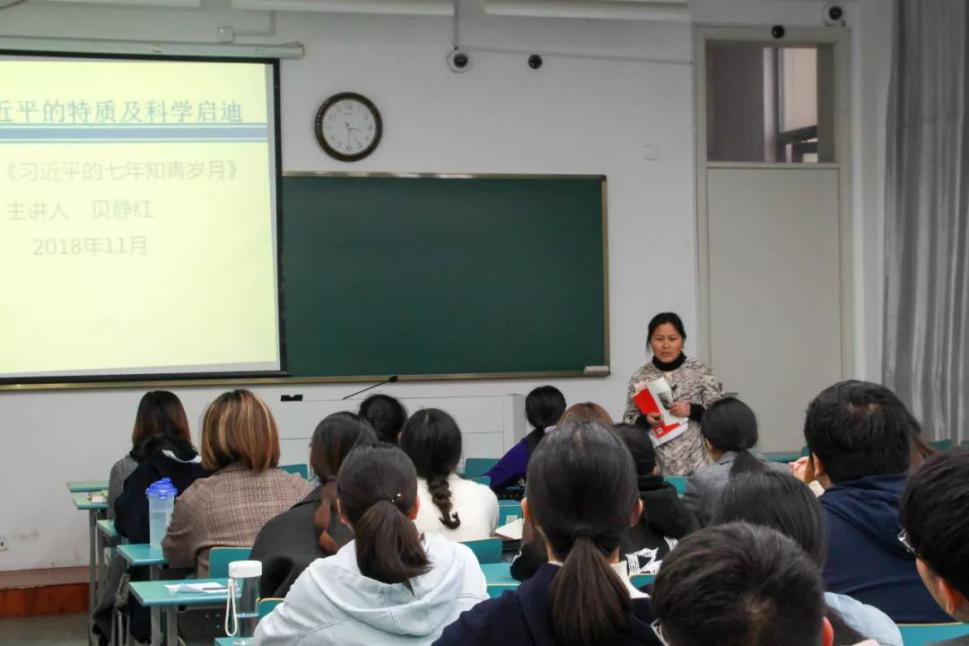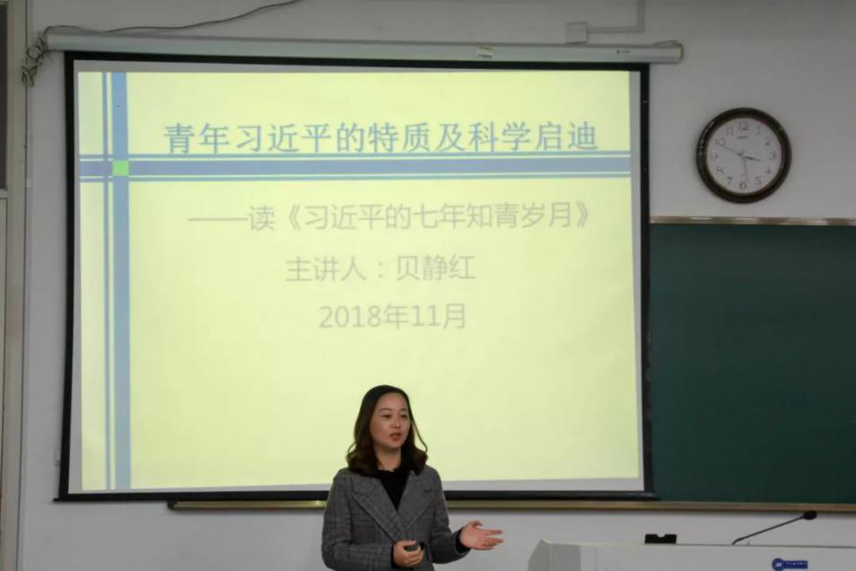 活动伊始,徐幼文老师首先对贝静红老师的到来表示欢迎,之后总结了近年来红色经典阅读工作的开展情况,希望大家能通过本次经典阅读活动有所思考、有所感悟、有所收获。贝静红老师从习近平总书记的《七年知青岁月》一书引入,结合了自己在延安的所见所感,讲述了习近平总书记的延安爱国教育之行,总结了青年习近平总书记的个人特质和思想感悟,用“知青说”、“村民说”、“各界说”向同学们展现了一个胸怀理想、实干为民、勤学善思、吃苦耐劳、坚毅担当、重情感恩的伟人形象,发人深省,同时她也对同学们提出了几点建议:1.不忘初心,方得始终;2.牢记使命,担当责任;3.不畏挫折,贵在坚持;4.贵在理解,重在行动;5.重视学习,参与实践;6.奋斗不息,走向幸福。她鼓励同学们自我思考,勇于担当,积极为班级、学院、学校做出贡献,现场的同学们也表达了各自的阅读感悟以及对习近平总书记作品的理解和认识。最后,现场齐声朗读习近平总书记党的十九大报告中的青年寄语,贝静红老师引用书中名言希望同学们能“化理论为德性,化理论为方法”。