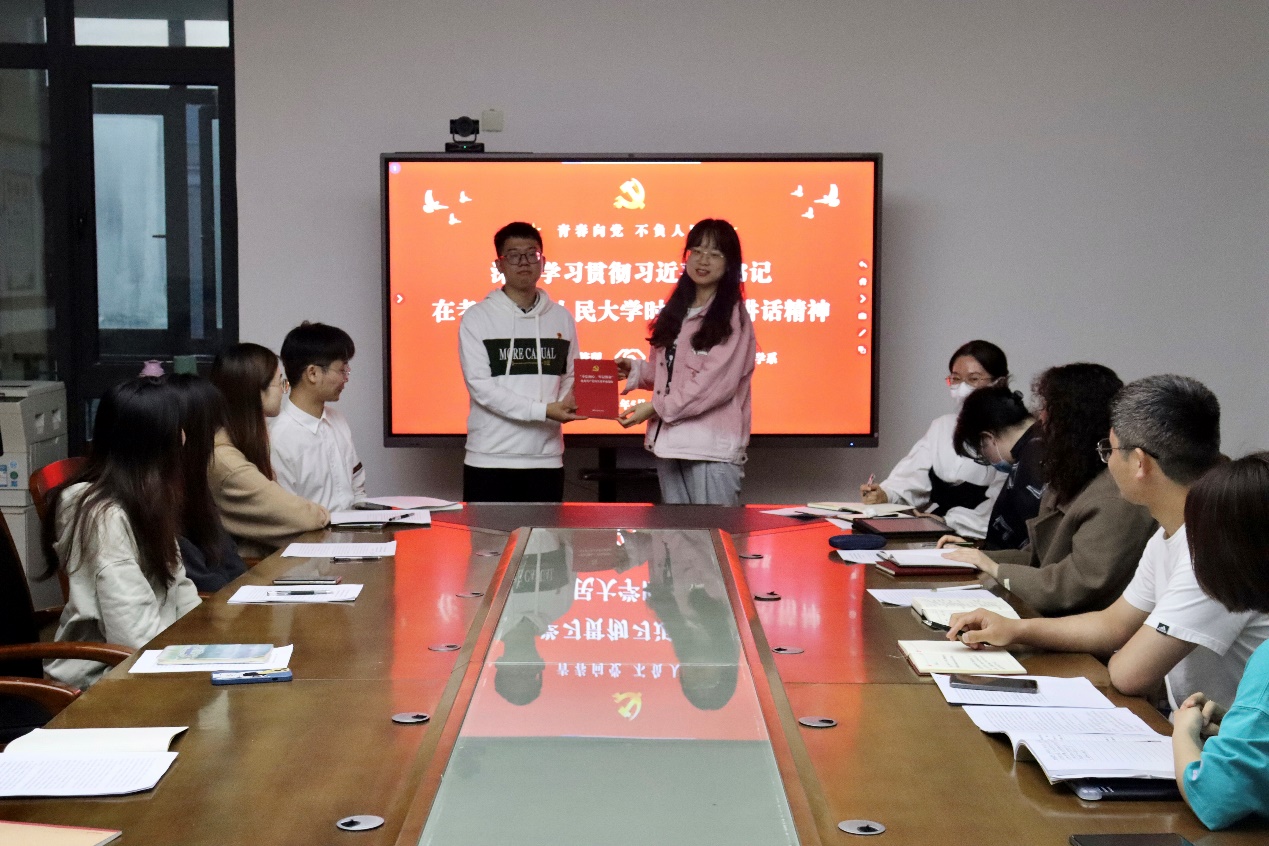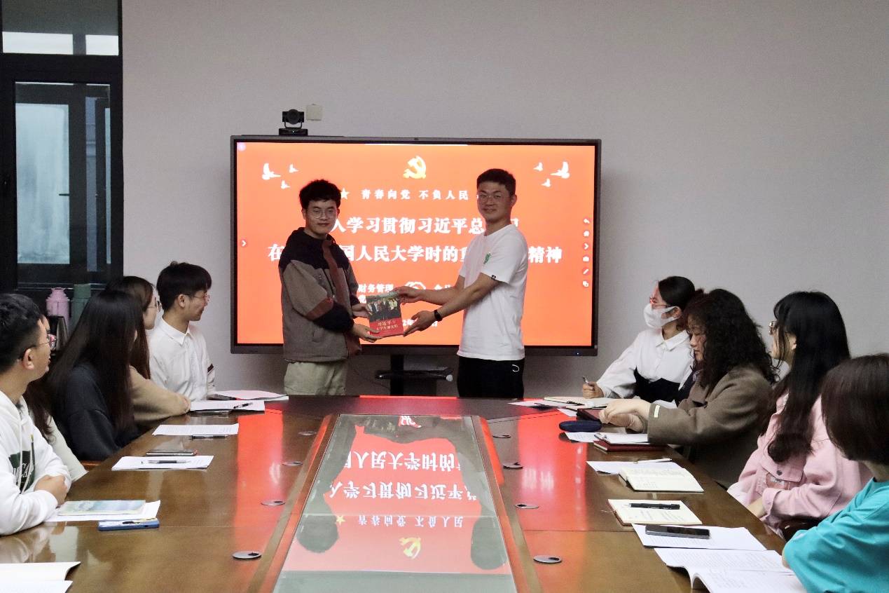 交流学习过后,两支部还开展了赠书活动,施辰阳老师为药学系学生党支部的学生代表胡倩男赠送了《“不忘初心、牢记使命”优秀共产党员先进事迹选编》,吴宇老师为财务管理专业学生第二党支部学生代表吴家麟赠送了《习近平与大学生朋友们》,活动旨在让阅读成为党员同志的力量源泉,自觉融入到党员同志的学习和生活当中。