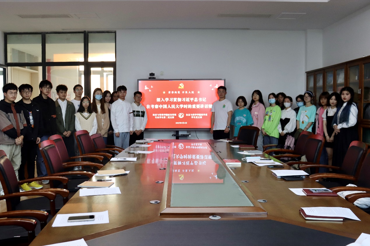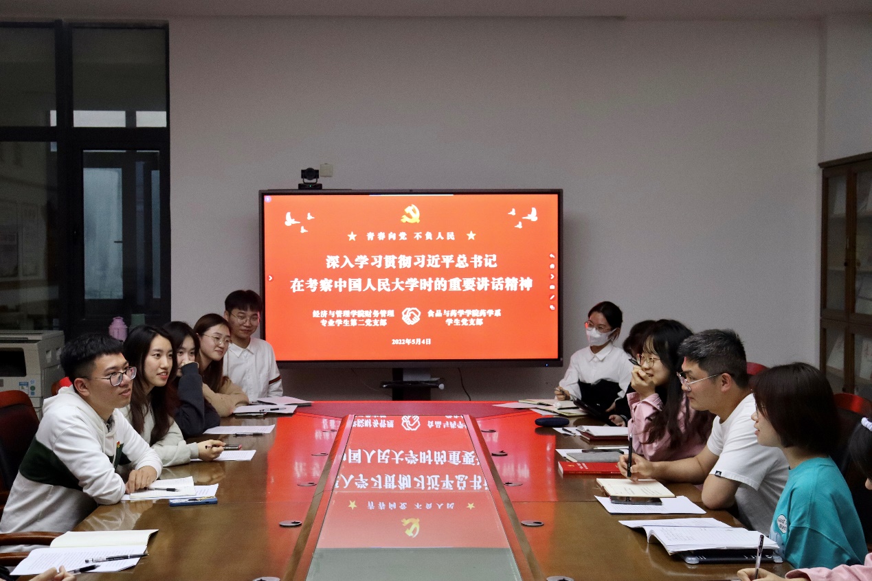 为迎接第72个“五四”青年节的到来,进一步引导和激励广大党员继承和发扬“五四”精神,为迎接党的二十大胜利召开营造良好氛围。2022年5月4日上午,黄色网站 财务管理专业学生第二党支部和食品与药学学院药学系学生党支部,在文理楼302-1会议室共同学习了习近平总书记在考察中国人民大学时的重要讲话精神。会议由财务管理专业学生第二党支部书记施辰阳主持,药学系学生党支部书记吴宇及两支部党员代表参加会议。