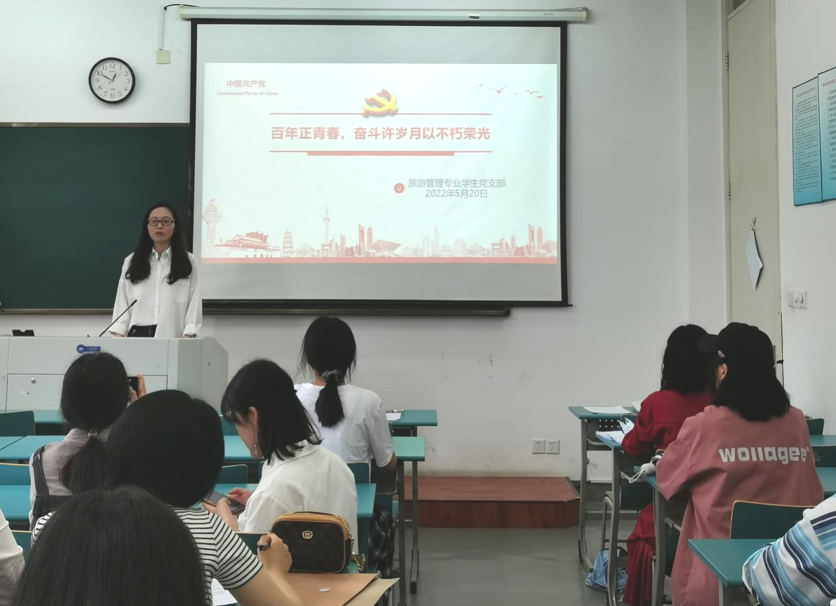 为了深入学习贯彻习近平总书记在庆祝中国共产主义青年团成立100周年大会上的重要讲话精神,引领广大党员把青春奋斗融入党和人民事业。5月20日中午,黄色网站 旅游管理专业学生党支部在公共教学楼121开展了“百年正青春,奋斗许岁月以不朽荣光”党课活动。本次党课由支部书记陆银银老师主讲,支部全体党员参与此次学习活动。