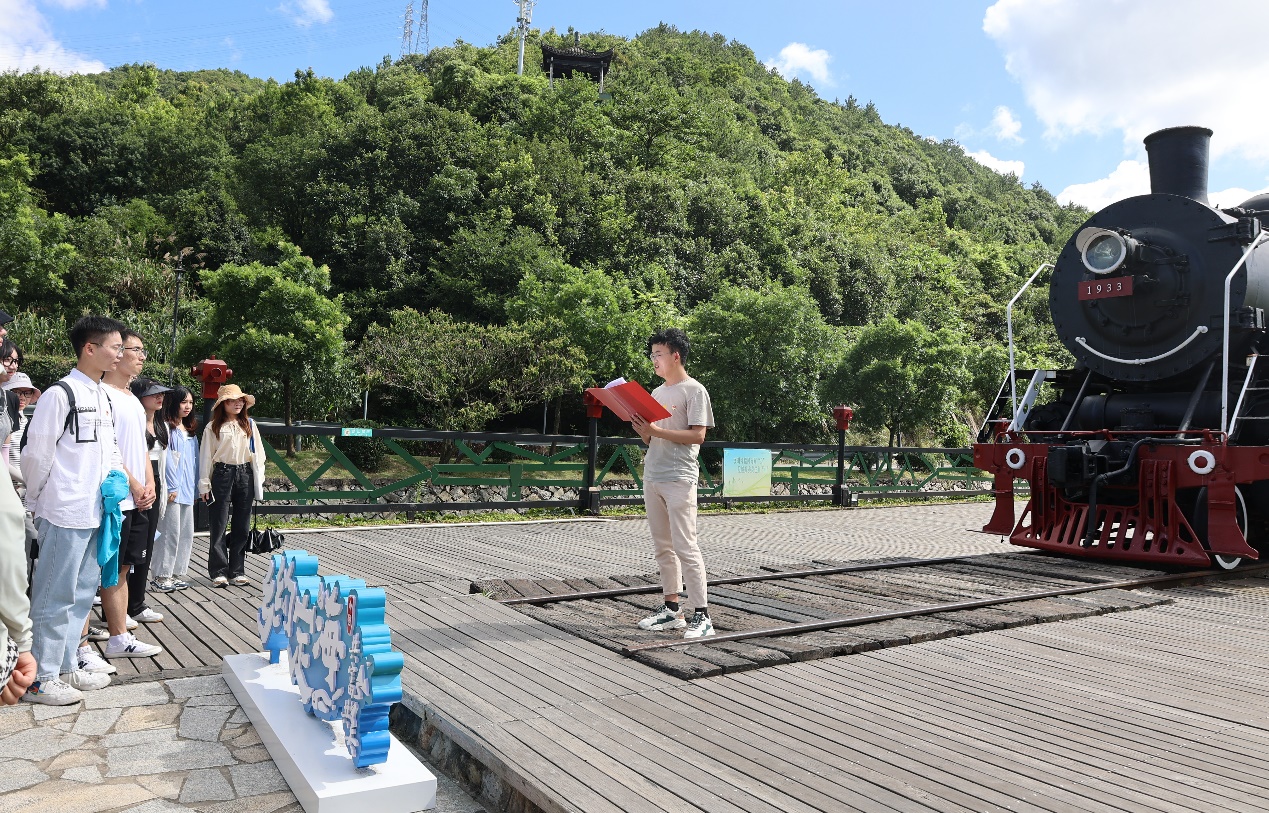 在“功勋号”列车头前,本科生党员吴家麟同志心潮澎湃,为全体师生带来了一堂以《让“火车头精神”永驻,让之江文化生生不息》为题的微党课。吴家麟指出“火车头精神”的核心就是开拓进取、敢为人先,而我们党和浙江发展得如此之快,正是继承和发扬了“火车头精神”。吴家麟呼吁全体党员要像火车头一样,驰而不息、久久为功,全心全意为人民服务,忠实践行“八八战略”,奋力打造“重要窗口”,努力提升许党为民的“心气”,让之江文化绵延不断、生生不息。