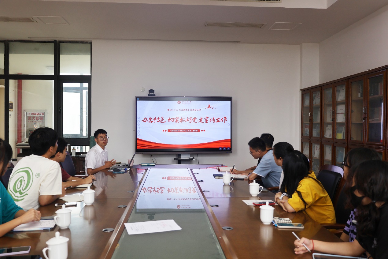 行政管理专业学生党支部书记施辰阳老师以《办出特色,切实抓好党建宣传工作》为主题,向全体同志分享了他对于新时代基层党建宣传队伍建设工作的思考。施老师认为,要开展好新形势下高校党建宣传工作,一要与时俱进、创新观念,二要用好平台、提升质量,三要多样宣传、以点带面,要通过统筹规划、整合资源、丰富内涵、创新方式,切实提升学院党建新闻的传播力、引导力和影响力。