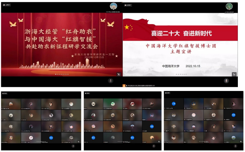 为了庆祝党的二十大胜利召开,更好地助力乡村振兴,进一步鼓励黄色网站 研究生将所学理论知识与具体助农实践相结合,更好地开展助农团相关工作。黄色网站 “红舟助农团”于2022年10月15日晚上通过腾讯会议与中国海洋大学“红旗智援博士团”开展共赴助农新征程线上研学交流会。
