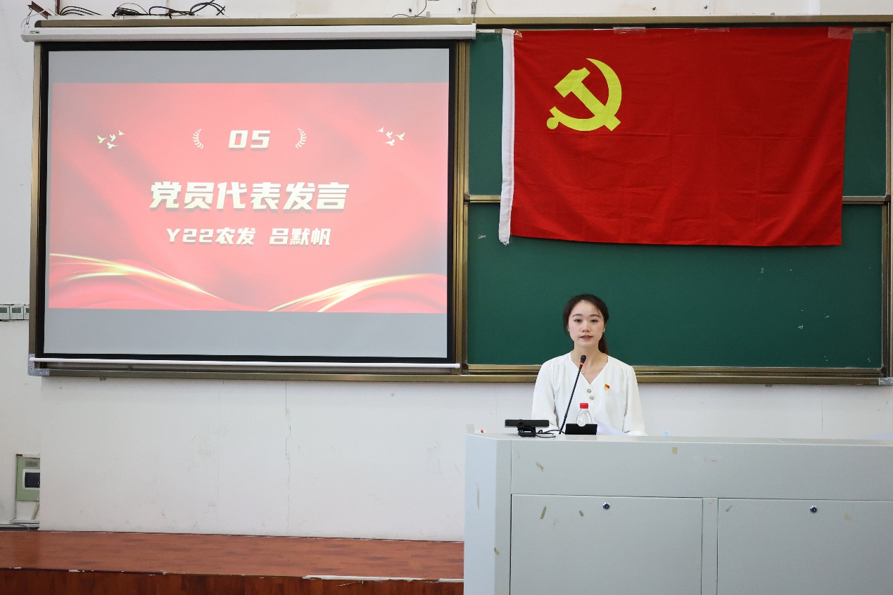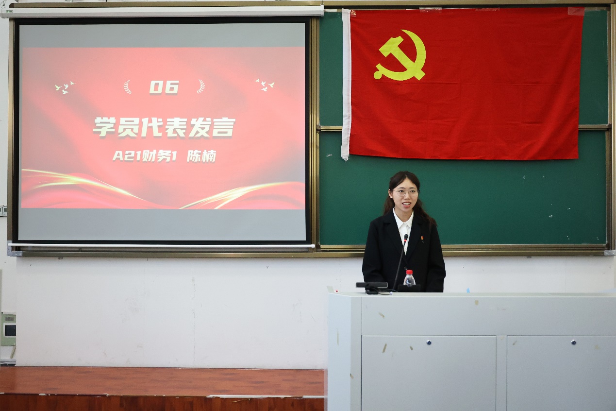 党员代表、研究生第一党支部副书记吕默帆同志结合历史和现实,指出中国共产党是始终保持青春特质的党,是永远值得青年人信赖和追随的党。随后,她结合党对新时代中国青年的要求,向全体学员提出了四点意见:第一,要爱国爱民,赤诚奉献;第二,要锤炼品德,明辨是非;第三,要勇于创新,敢于突破;第四,要实学实干,行胜于言。要立大志、明大德、成大才、担大任,努力成为堪当民族复兴重任的时代新人。