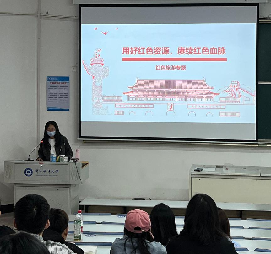 2022年11月5日下午,旅游管理专业学生党支部结合本专业特点,从实践性和教育性出发,在定海校区教学楼153面向2022级新生开展《用好红色资源,赓续红色血脉》专题讲座,本次讲座由支部党员陆许怡同志主讲,A22旅游1、2团支部、G22旅游团支部同学出席讲座。讲座从红色旅游内涵,红色旅游对政治、经济、文化的作用,舟山红色旅游资源介绍三方面展开,让旅游管理专业的同学们对于舟山红色旅游的发展现状有了更为清楚的认识,更为2022级旅游学子传承红色基因,点亮海岛“红色风景线”奠定了重要基础。