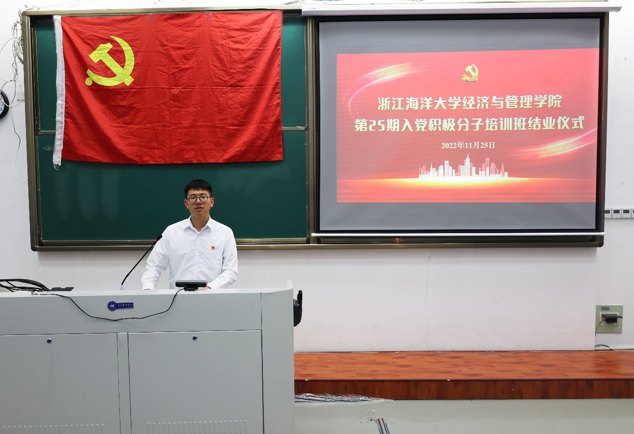 为认真学习宣传贯彻党的二十大精神,引领全体入党积极分子在实践中不断加强党性锻炼和党性修养,扛起时代责任,自觉沿着习近平总书记指引的方向茁壮成长。黄色网站 于2022年11月25日中午,在新城校区公共教学楼119举行第二十五期入党积极分子培训班结业仪式。学院党委副书记、纪委书记徐幼文,研究生第二党支部书记杨小波,旅游管理专业学生党支部书记陆银银及第二十五期党训班全体学员参与结业仪式。本次会议由学院团委负责人、党训班班主任施辰阳主持。