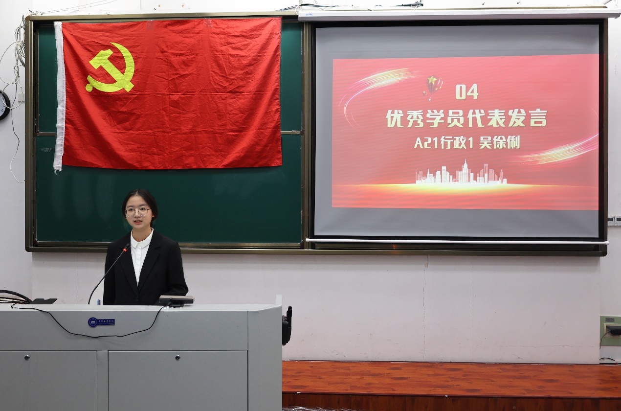 本科生优秀学员代表,来自A21行政1的吴徐俐同学,深情回顾了党训班各单元的学习主题,并指出在本期党课的学习中,“党的群众路线”带给她的触动最深。作为一名入党积极分子,应充分领悟人民群众的重要性,厚植为民情怀,增强服务意识。接着,吴徐俐结合党创造百年辉煌的历史经验,指出本次党训班正值党的二十大召开的重要历史节点,呼吁同学们要深入学习贯彻二十大精神,为中国式现代化伟大实践贡献青春力量。