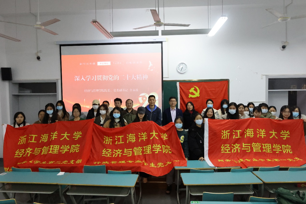 最后,全永波院长呼吁全体师生党员要认真学习党的二十大报告,深入理解内涵,精准把握外延,感受其中的睿智与力量,并将其融入学院和学科发展全过程,切实把学习成果转化为生动实践和实际成效。同时,全院长呼吁大家要将个人发展融入到学院和学校发展的洪流中,为谱写中国式现代化新篇章贡献经管力量。