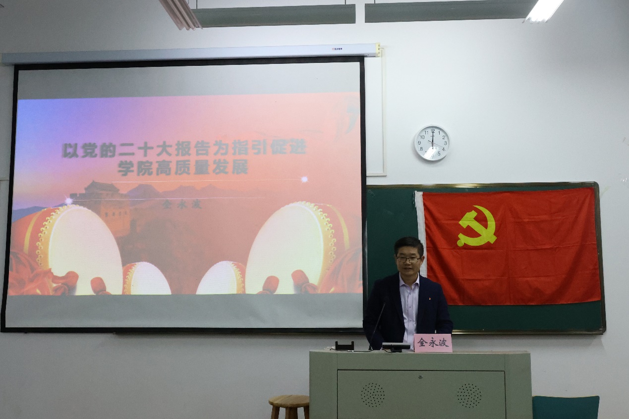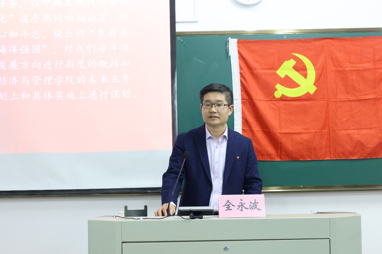全永波院长指出,党的二十大报告充分肯定了党和国家事业取得的举世瞩目的成就,明确提出了新时代新征程中国共产党的使命任务,系统阐释了中国式现代化的中国特色、本质要求、战略安排、重大原则。中国式现代化极大地激发了全党全国人民奋勇向前的决心和斗志,提出的“发展海洋经济,保护海洋生态环境,加快建设海洋强国”,对我国海洋领域的人才培养、科学研究和社会服务的发展方向进行了高度概括与凝练。全院长指出,结合学院未来五年乃至更长时期,我们应该在战略规划和具体实施上进行谋划、力求突破。