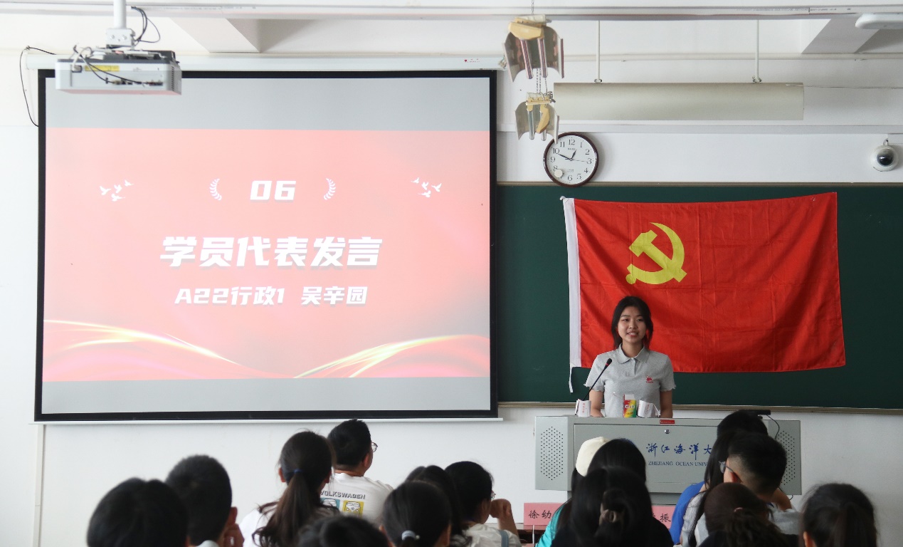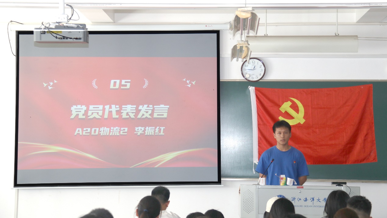 党员代表、物流管理专业学生党支部的李振红同志结合历史和现实,指出中国共产党是值得永远追随的党,党的理论知识与时俱进,指引前行。随后,他强调青年学生应当以青春奋进的姿态投入到全面建设社会主义现代化国家的火热实践中去,坚定不移听党话,矢志不渝跟党走。最后,他鼓励全体入党积极分子要牢记习近平总书记的嘱托,紧握时代接力棒,踔厉奋发、勇毅前行,努力成为信念坚定、矢志报国、求真务实的新时代合格党员。