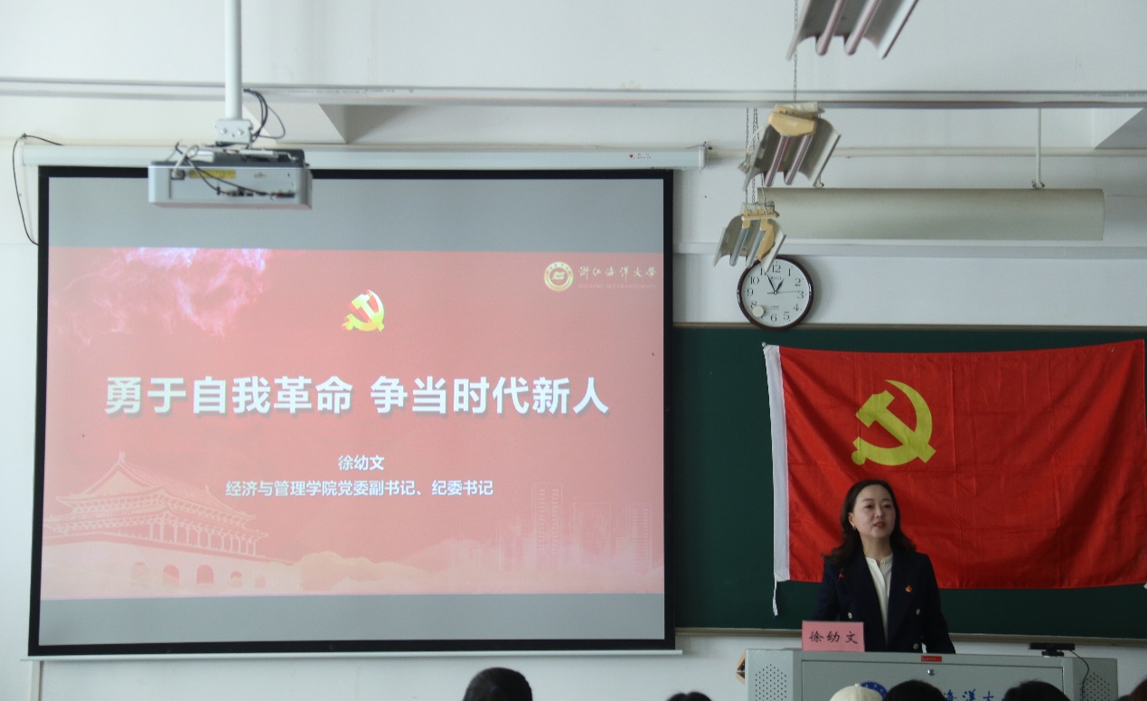 第二十六期入党积极分子培训班开班仪式在全体师生齐唱国际歌中落下帷幕。随后,徐幼文副书记以《勇于自我革命,争当时代新人》为题,为全体入党积极分子开展党训班第一课。徐书记从历史周期率引出自我革命这一话题,指出自我革命是马克思主义政党的内生特质,并深入分析了中国共产党坚持自我革命的必要性。接着,她回顾了百年党史中最具历史意义的六次自我革命,让同学们认识到全面从严治党永远在路上,党的自我革命永远在路上。最后,徐书记呼吁同学们也都能成为勇于自我革命的时代新人,并向同学们提出三点要求:第一,要坚定理想信念,站稳政治立场;第二,要敢于直面问题,勇于担当尽责;第三,要善于努力拼搏,努力增长才干。