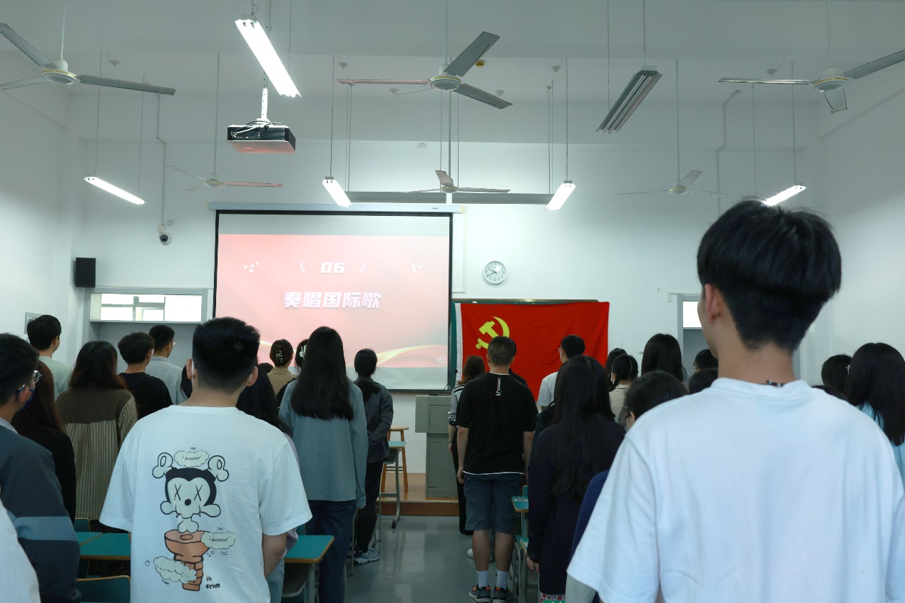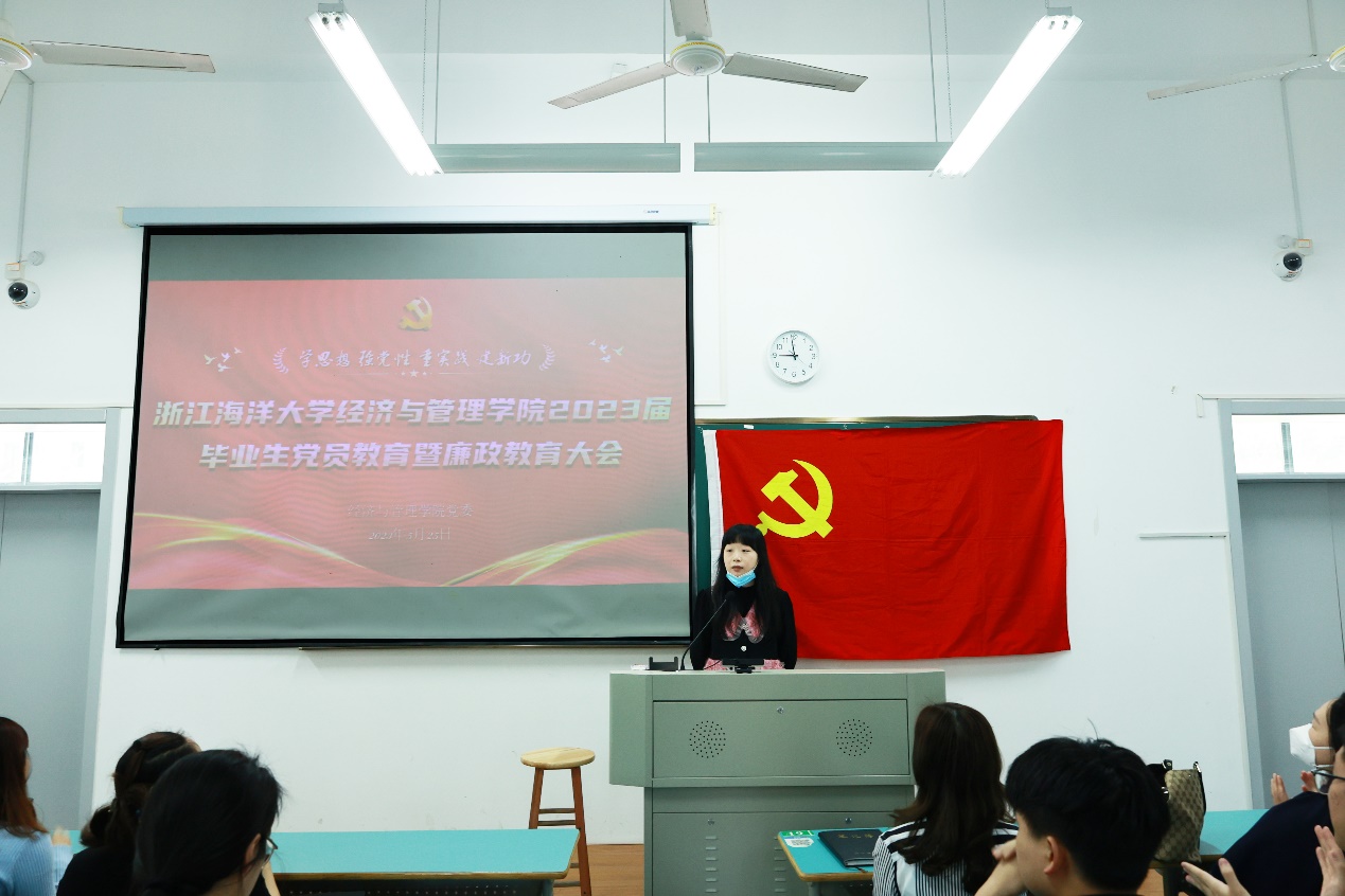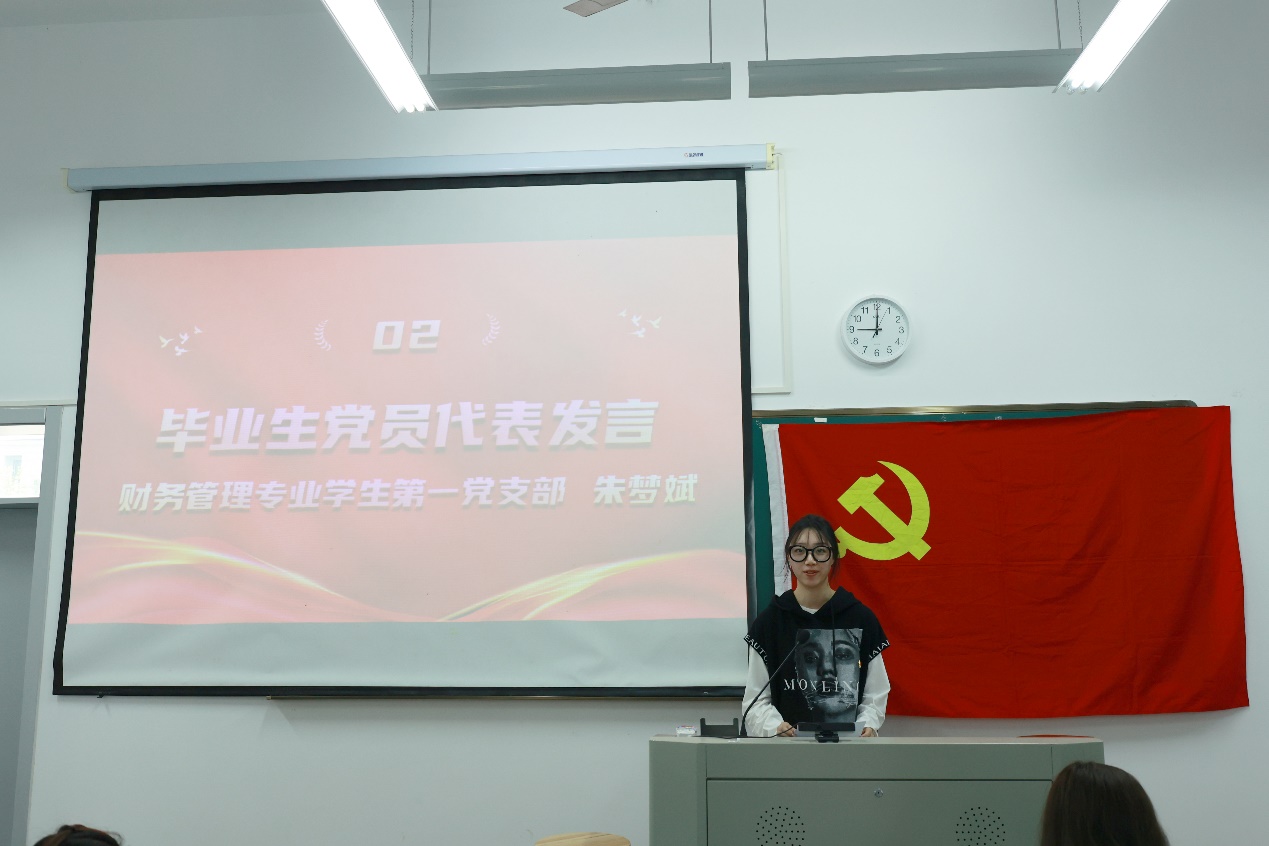 大会在庄严肃穆的国歌声中拉开帷幕。随后由毕业生党员代表、浙江省优秀毕业生朱梦斌同志发言,朱梦斌声情并茂、掷地有声的发言让大家看到了她对母校的眷恋与不舍,也看到了她对未来学习生活的期待与憧憬。朱梦斌呼吁全体党员加强理论学习、坚持实践学习、做好本职工作,一如既往地以一个优秀共产党员的标准严格要求自己,时时叩问初心、处处践行使命,永远保持“赶考”的清醒。