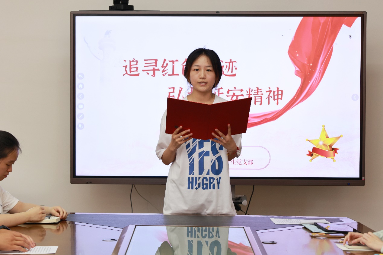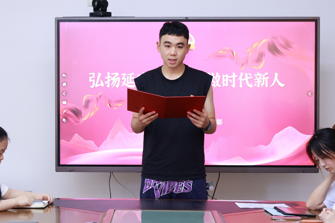 会上,张京平和杨蒙蒙同志结合自身暑期赴中国革命摇篮——延安,开展“双百双进”暑期社会实践活动和学习贯彻习近平新时代中国特色社会主义思想主题教育的经历,为同学们分享了他们学习延安精神的心得体会。张京平同志以“弘扬延安精神,争做时代新人”为主题,向同学们分享了他在延安革命纪念馆、杨家岭革命旧址、枣园、王家坪等红色基地,深刻领悟党中央在延安十三年的光辉历程、辉煌成就和宝贵经验的经历。杨蒙蒙同志以“追寻红色足迹,弘扬延安精神”为主题,分享了她在延安期间,根据红色文化资源的多种载体形式,运用看、听、学、思、悟、记等多种方式进行有温度、有高度、有深度的党史学习,带领大家深刻认识了延安精神的意涵及当代价值。