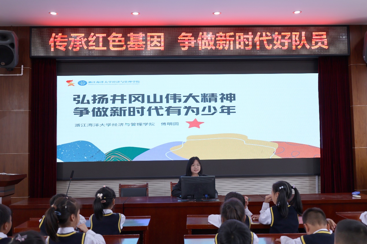 为更好地落实团建带队建,明确少先队工作政治方向,实践团优秀共青团员傅明圆同学,为舟山海山小学的同学们精心设计了一堂以“弘扬井冈山伟大精神,争做新时代有为少年”为主题的队课。傅明圆同学结合在井冈山9天研学过程中一则则让她深受触动的真实故事——学编红军草鞋、学唱红色歌谣、采访神山村左伟鑫小朋友、参观小井红军医院……用生动可爱的图片、幽默诙谐的语言、轻松愉快的互动,让少先队员们从英雄故事中读懂忠诚、学会担当、激发梦想,深刻领会了“坚定执着追理想、实事求是闯新路、艰苦奋斗攻难关、依靠群众求胜利”的井冈山精神。